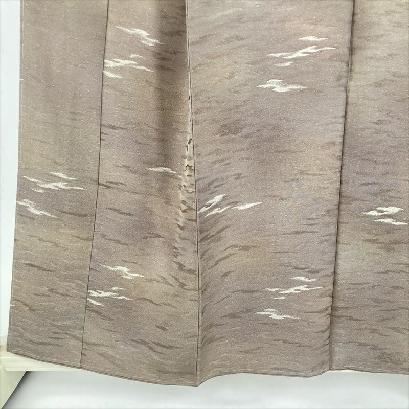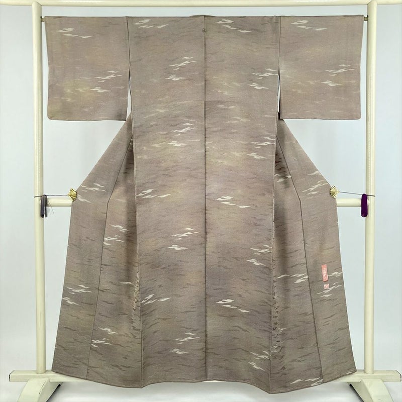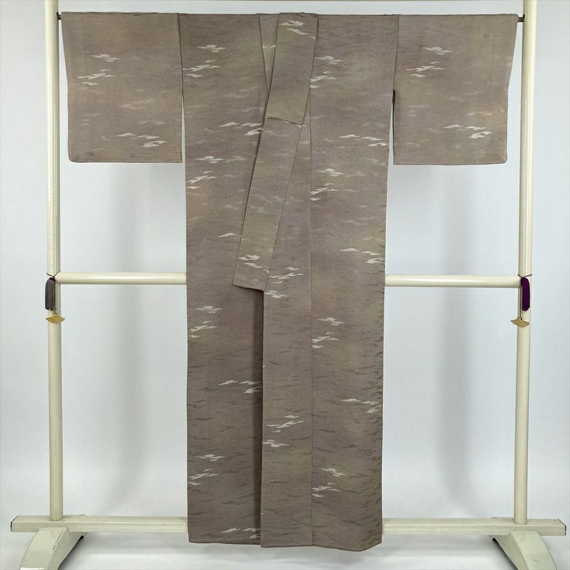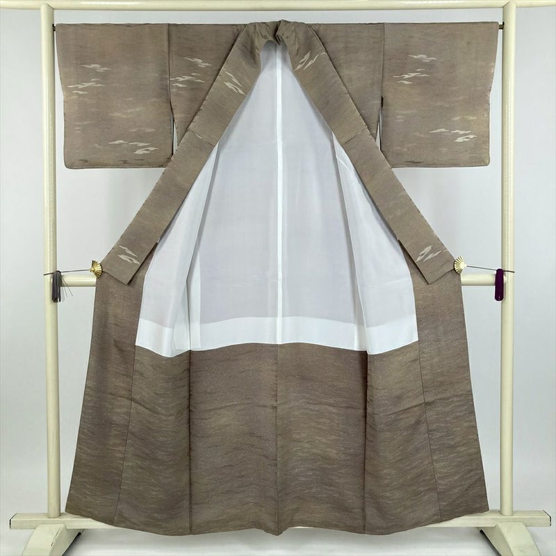 (中古) 小紋 カーキ 茶 カジュアル セミフォーマル 小島利造 地紋織り 染め 霞 袷 絹【身丈】151cm【裄丈】67cm