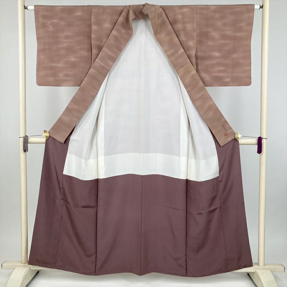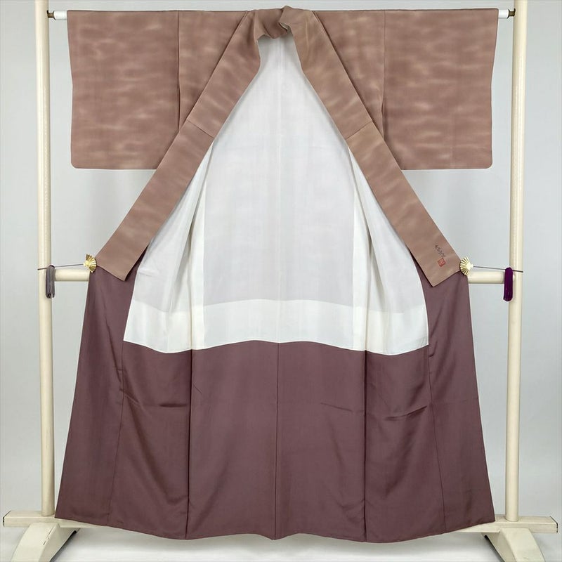 落ち着いた配色の中に、光の加減で表情を変える、奥深い色彩が魅力。熟練の職人技による、丁寧なぼかし染めは、着物全体に奥行きと立体感を与え、上品な華やかさを演出します。