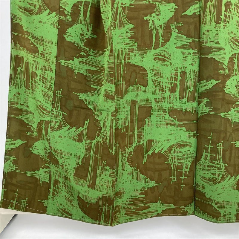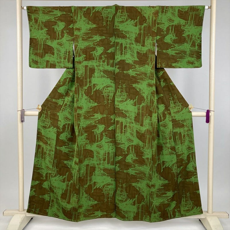(中古) 小紋 茶 緑 カーキ カジュアル 抽象柄 袷 絹 【身丈】152cm【裄丈】64.5cm
