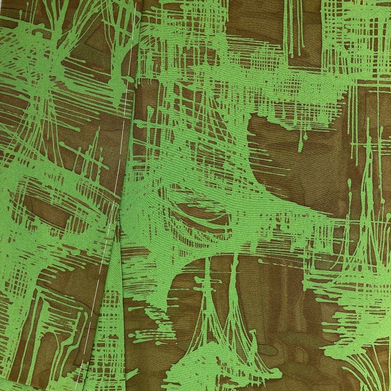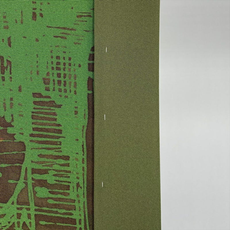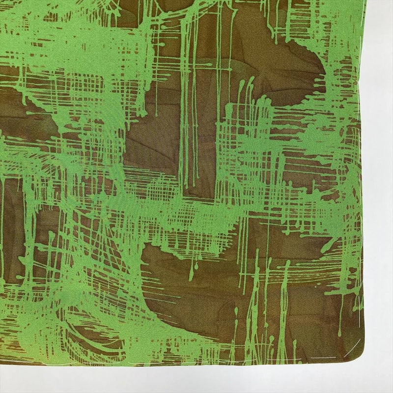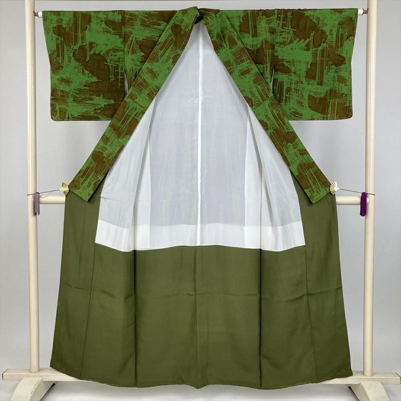 独特のシボを持つちりめんの風合いと、深みのあるカーキ色の組み合わせが、落ち着いた大人の魅力を引き出します。抽象的な柄は、見る角度によって様々な表情を見せ、着る人を飽きさせません。