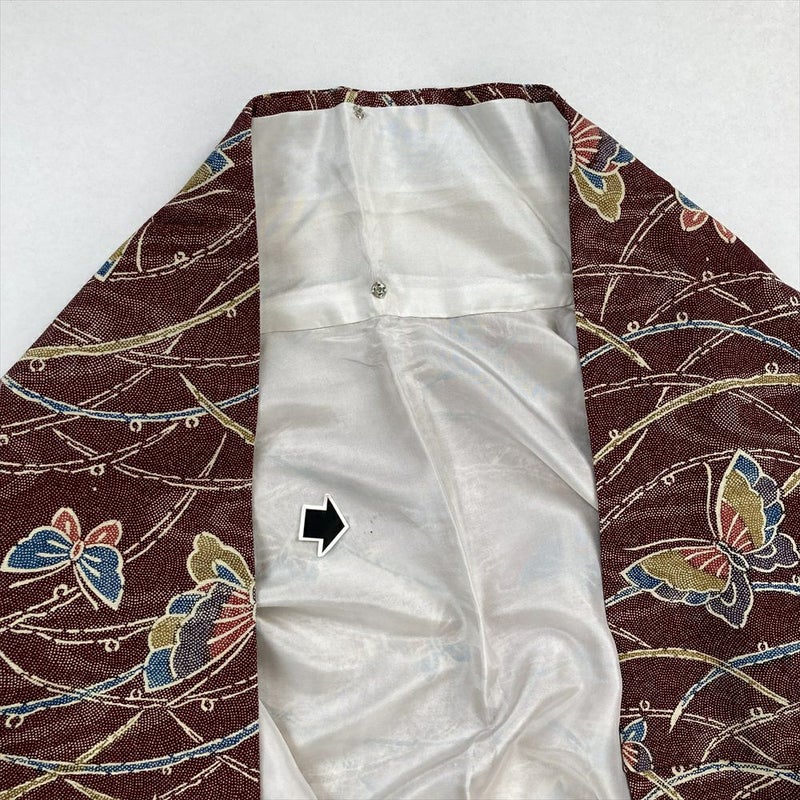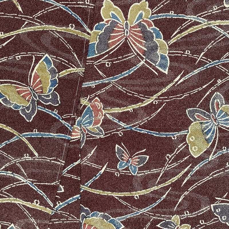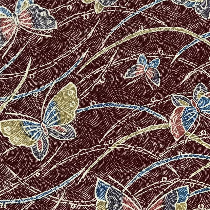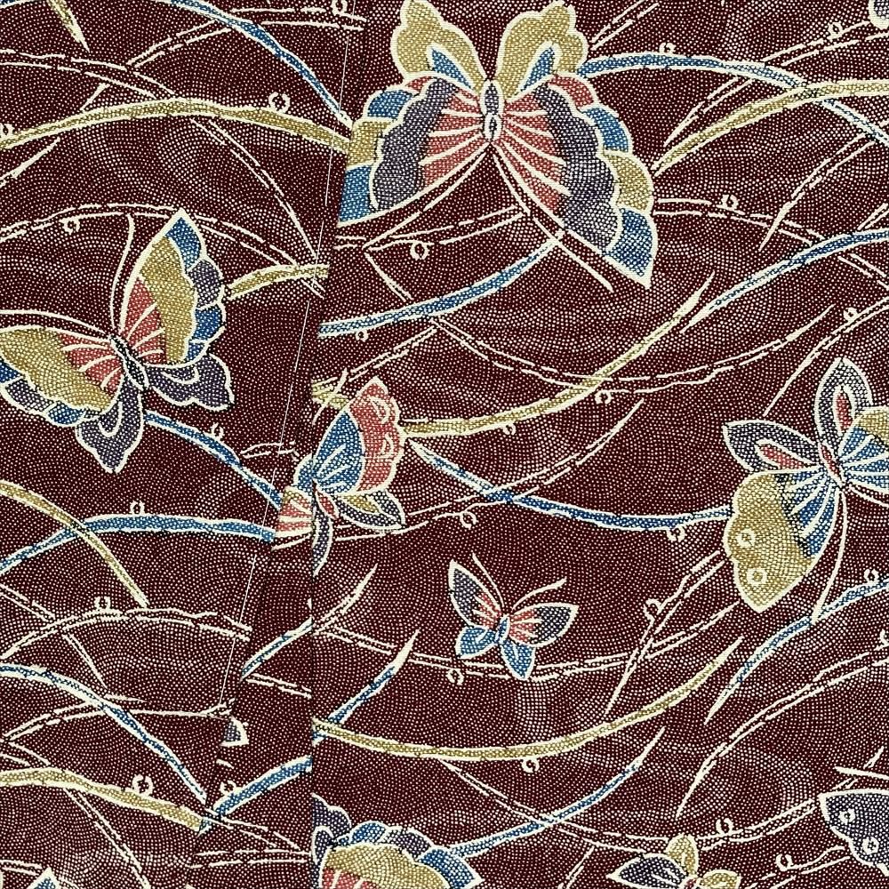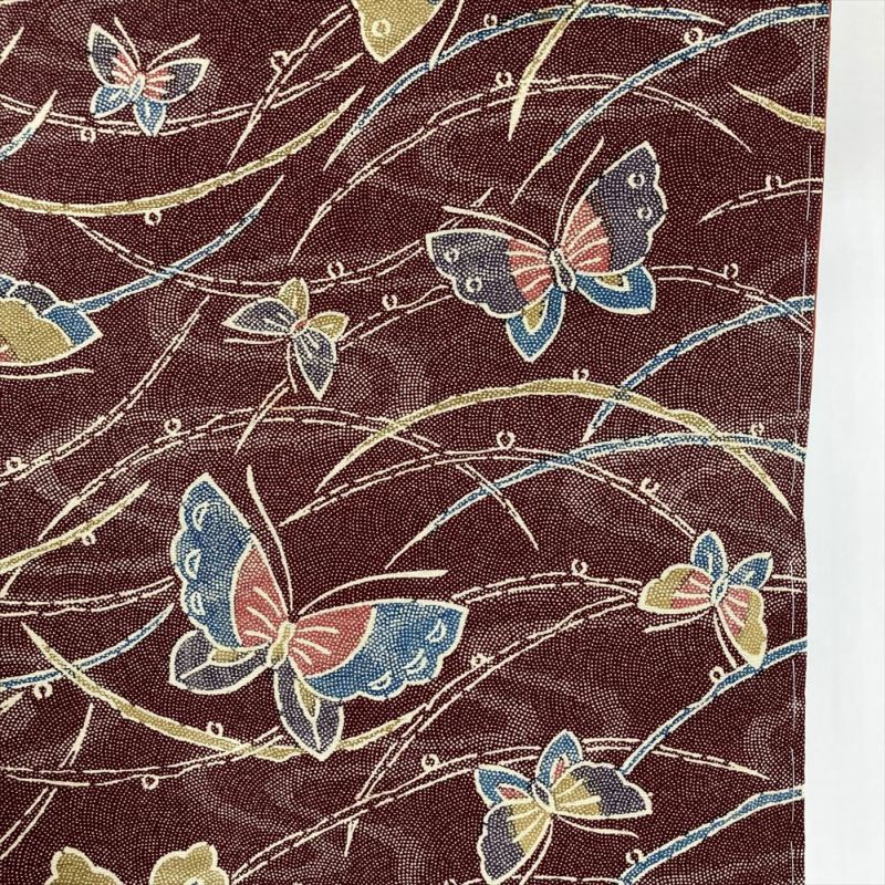 深い臙脂色を背景に、様々な色の蝶々がひらひらと舞う、なんとも愛らしい正絹小紋。