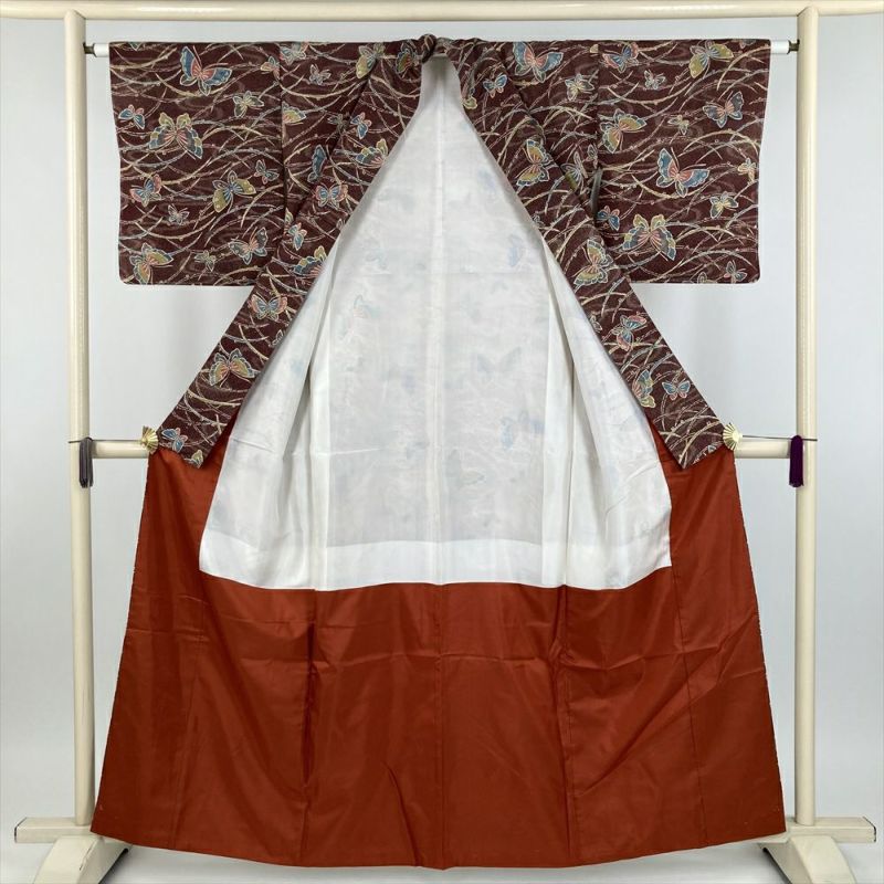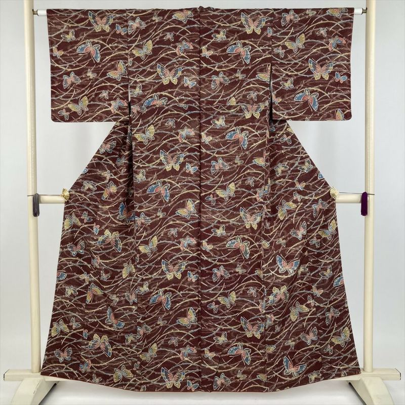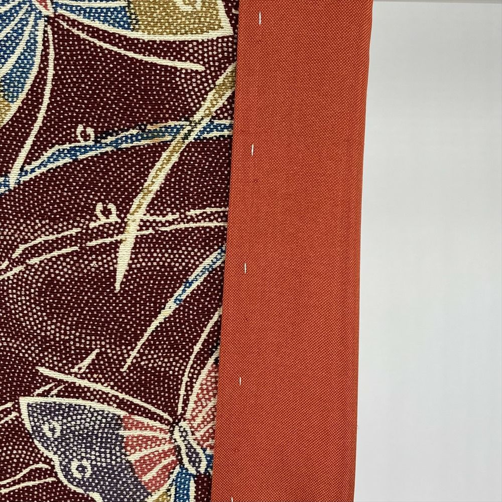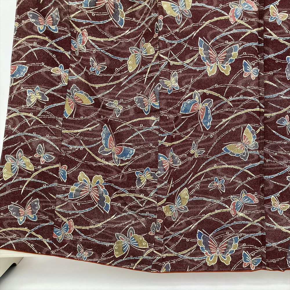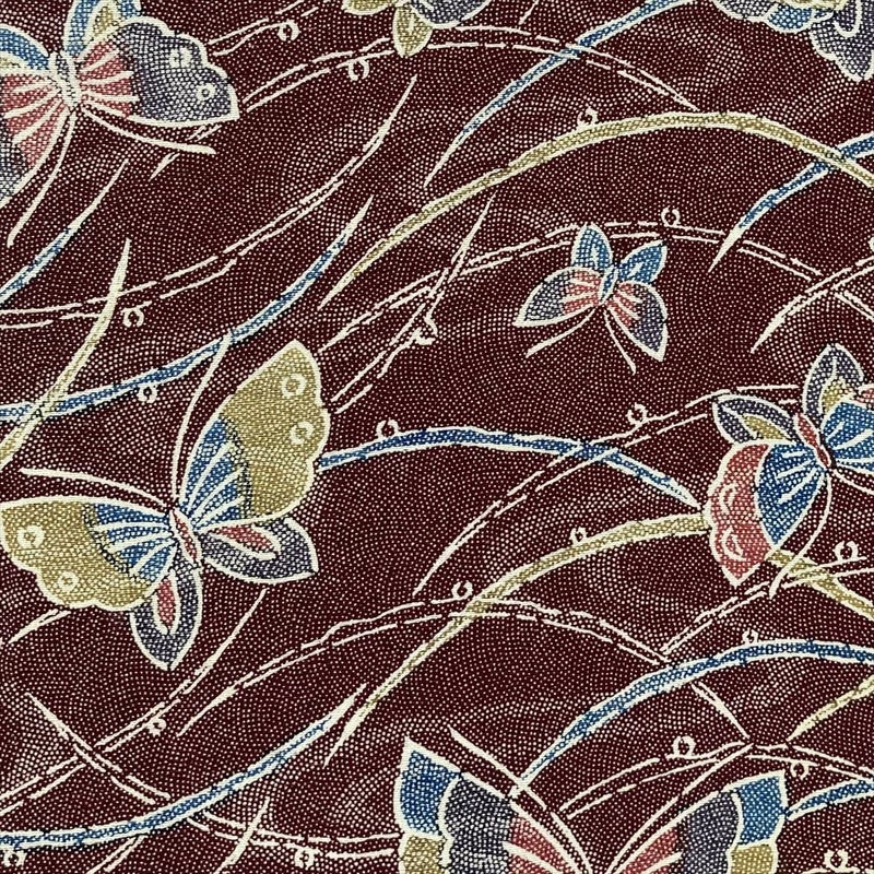 深い臙脂色を背景に、様々な色の蝶々がひらひらと舞う、なんとも愛らしい正絹小紋。