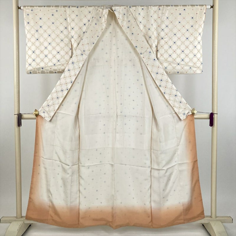 (中古) 小紋 アイボリー色 生成 カジュアル 地紋織り 染め 絞り 小花柄 袷 絹【身丈】154cm【裄丈】65cm