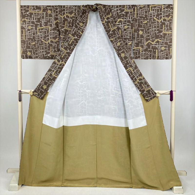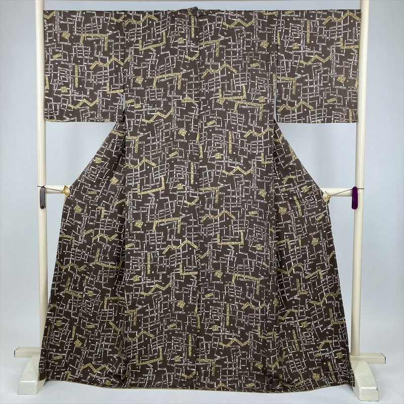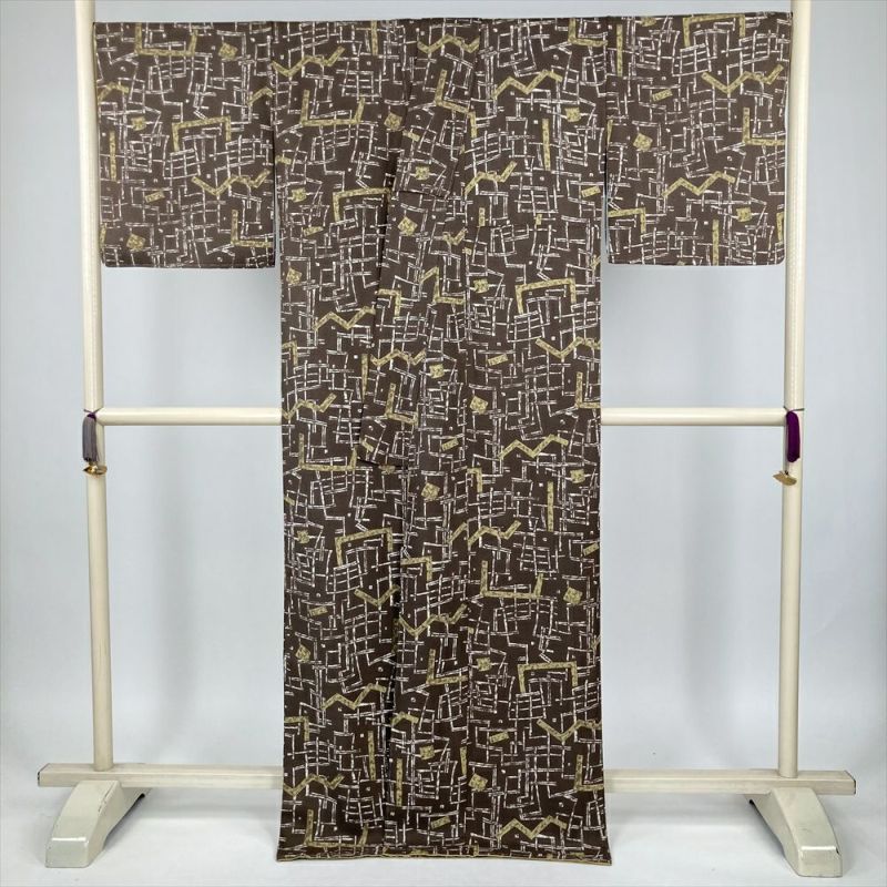 (中古) 小紋 ココア カジュアル 幾何学文様 袷 絹 【身丈】161.5cm【裄丈】69cm
