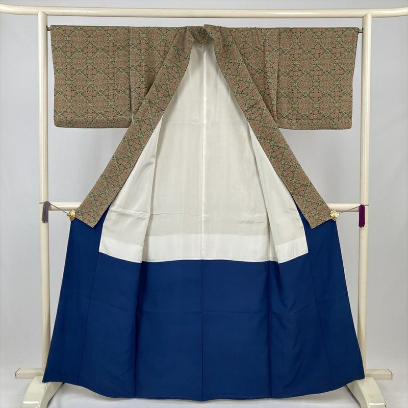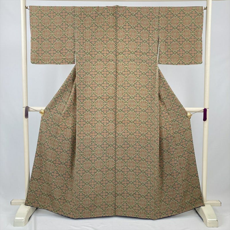 (中古) 小紋 緑 カジュアル オリエンタル菱 袷 絹 【身丈】157.5cm【裄丈】66cm