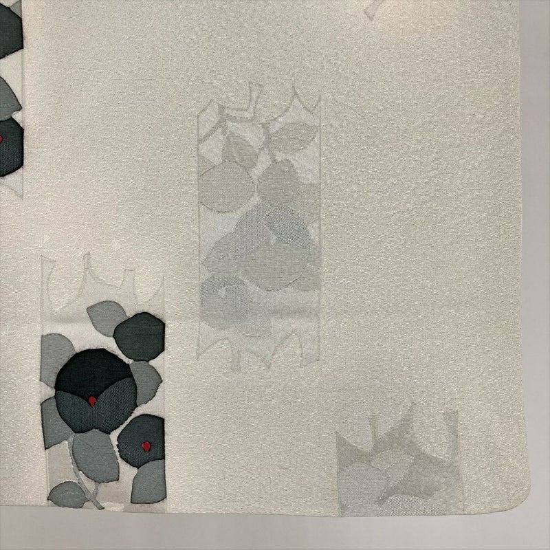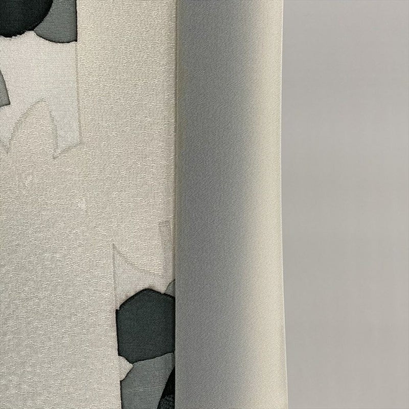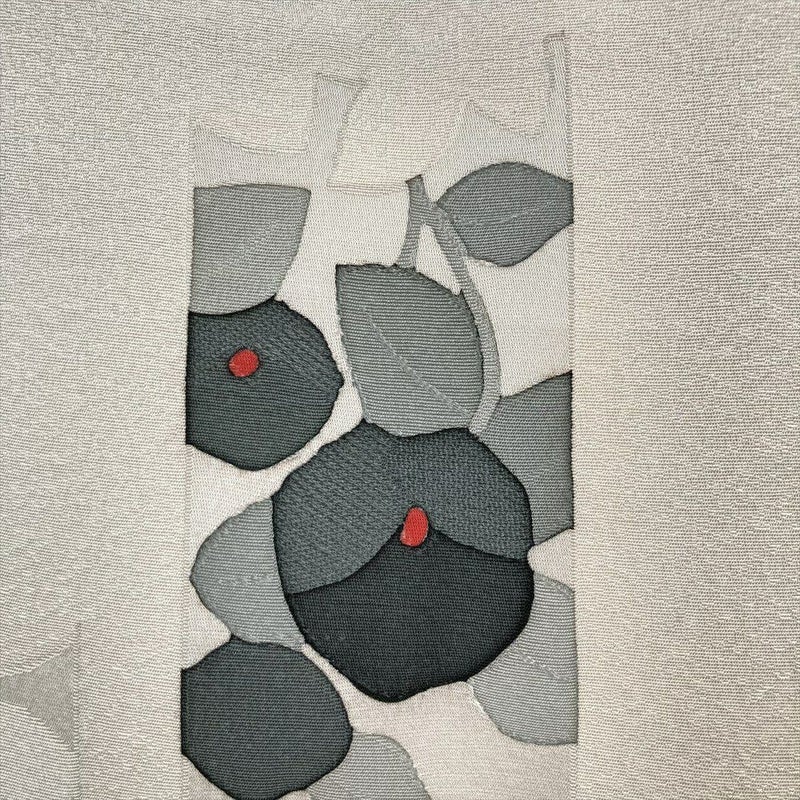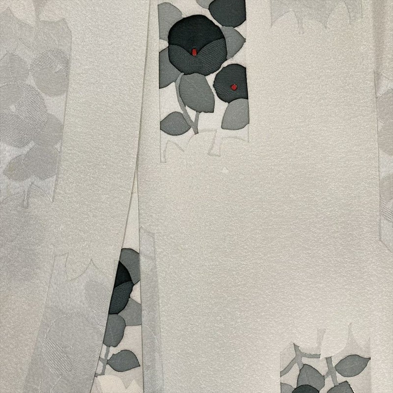 落ち着いたモノトーンの色調に、凛と咲く椿の柄が印象的な小紋です。