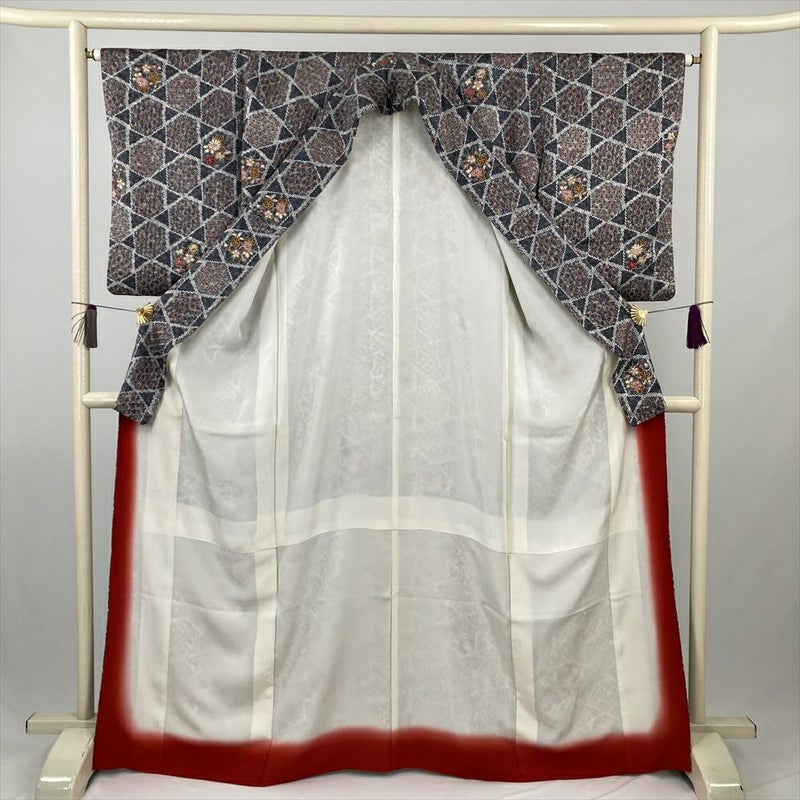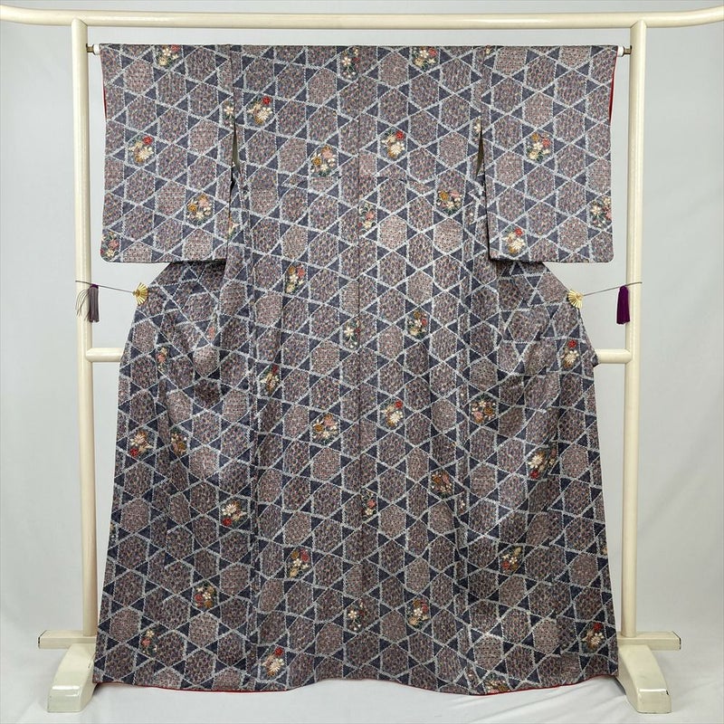 (中古) 小紋 グレー 灰色 カジュアル 籠目 春秋花文 袷 絹 【身丈】163.5cm【裄丈】64cm