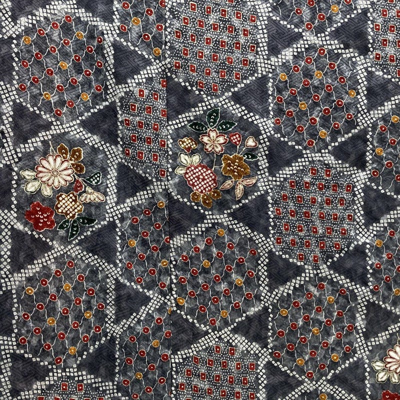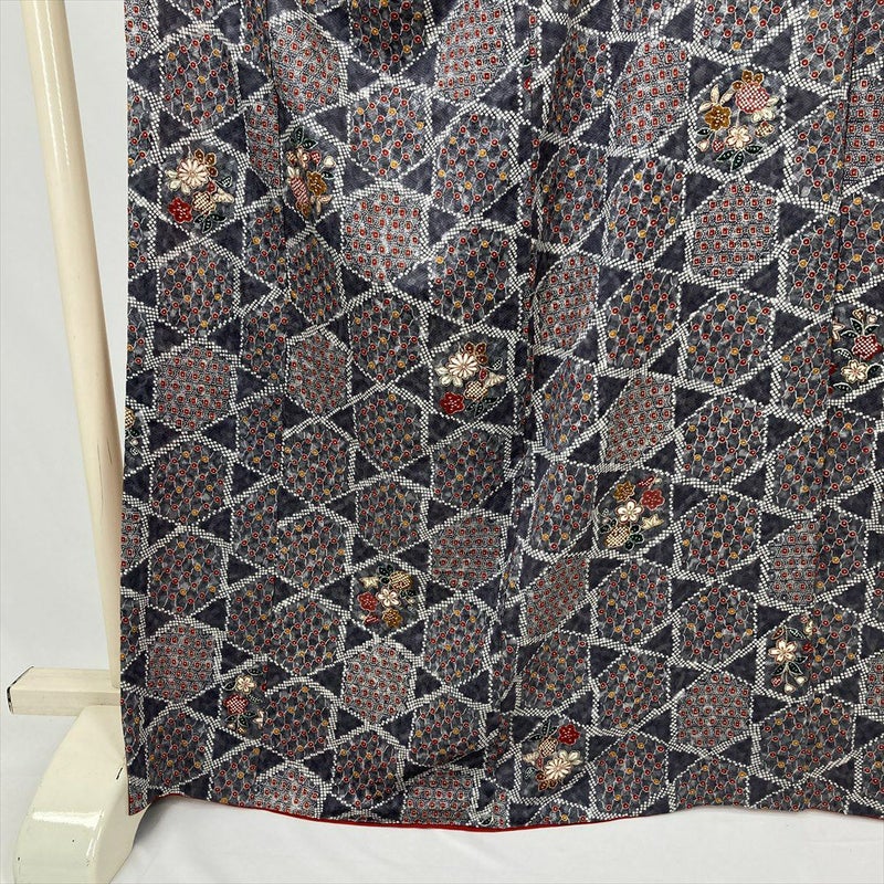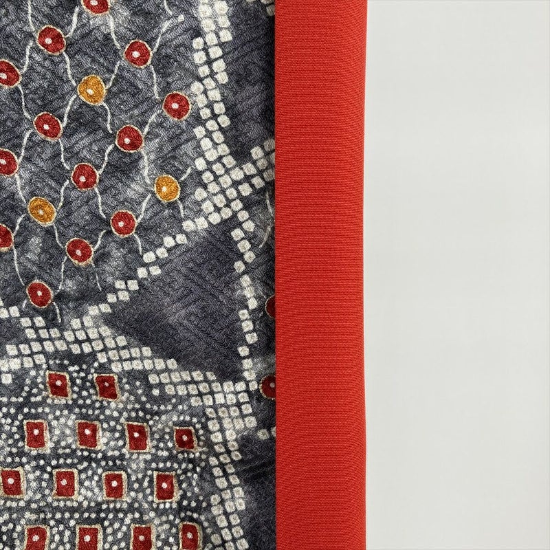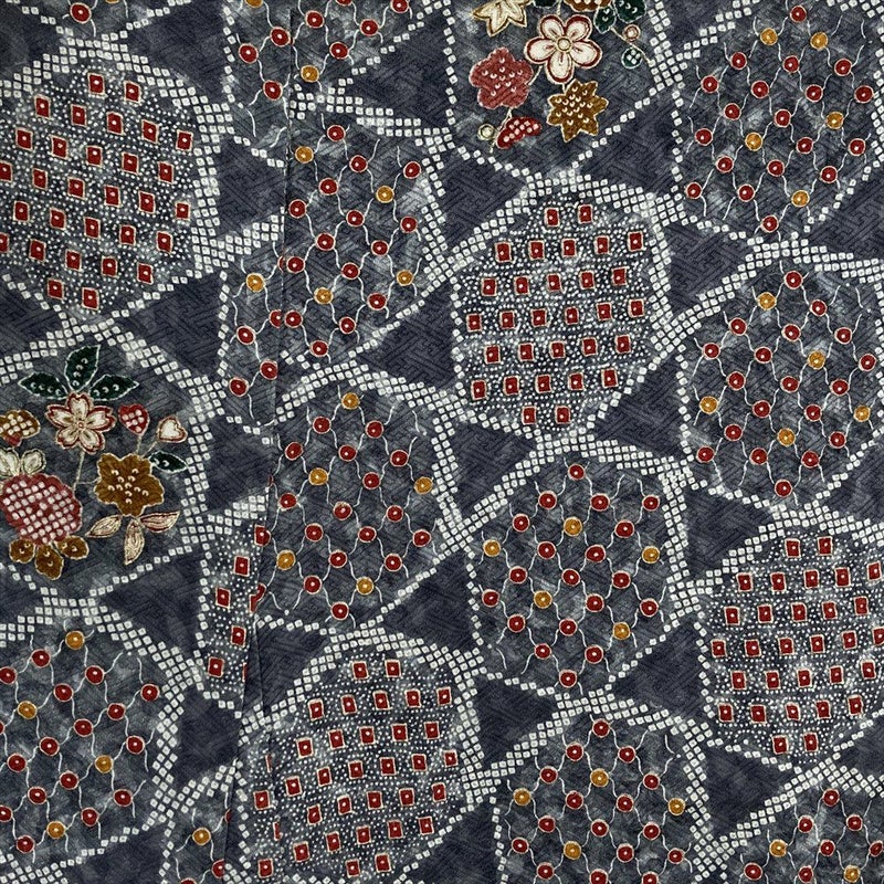 落ち着いたグレーの地色に、赤の彩色がアクセントとなった総柄の小紋です。