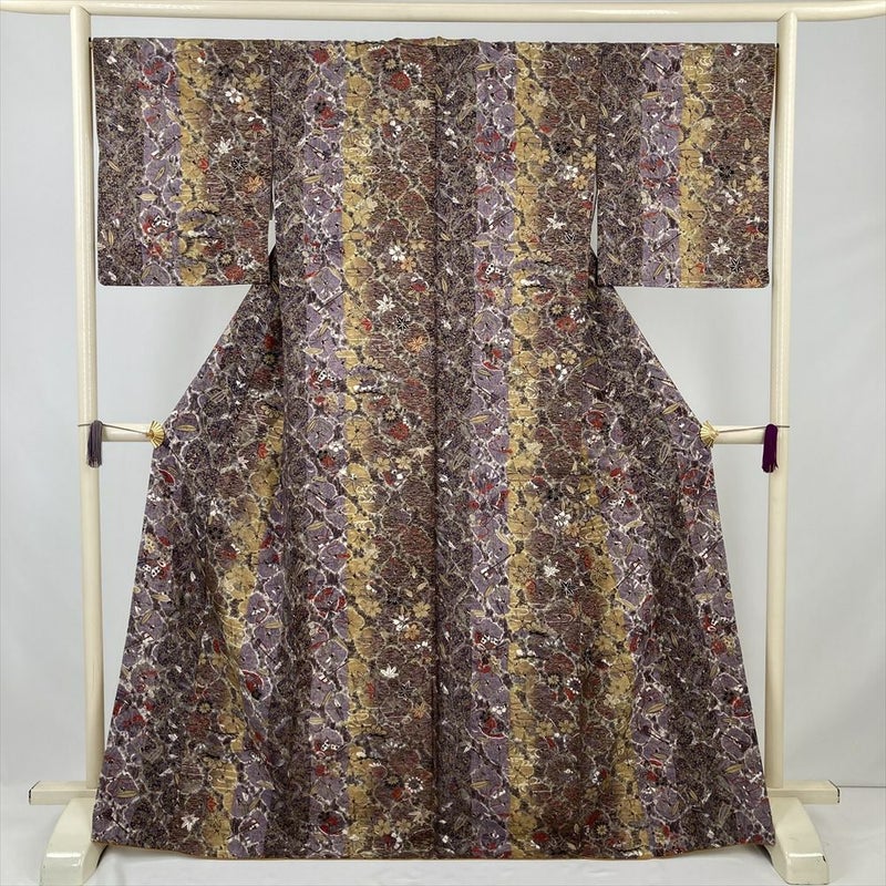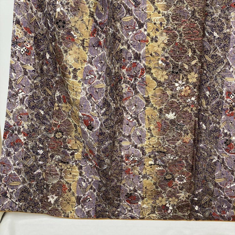 (中古) 小紋 紫 カジュアル 花蝶 袷 絹 【身丈】163cm【裄丈】68cm