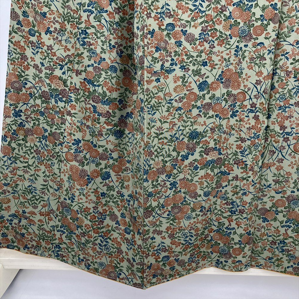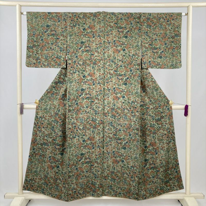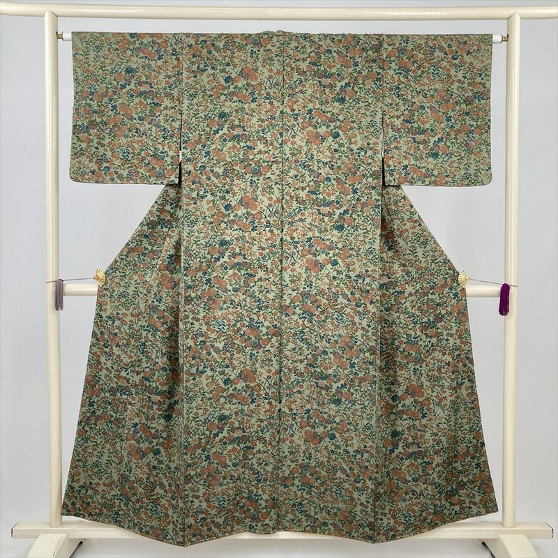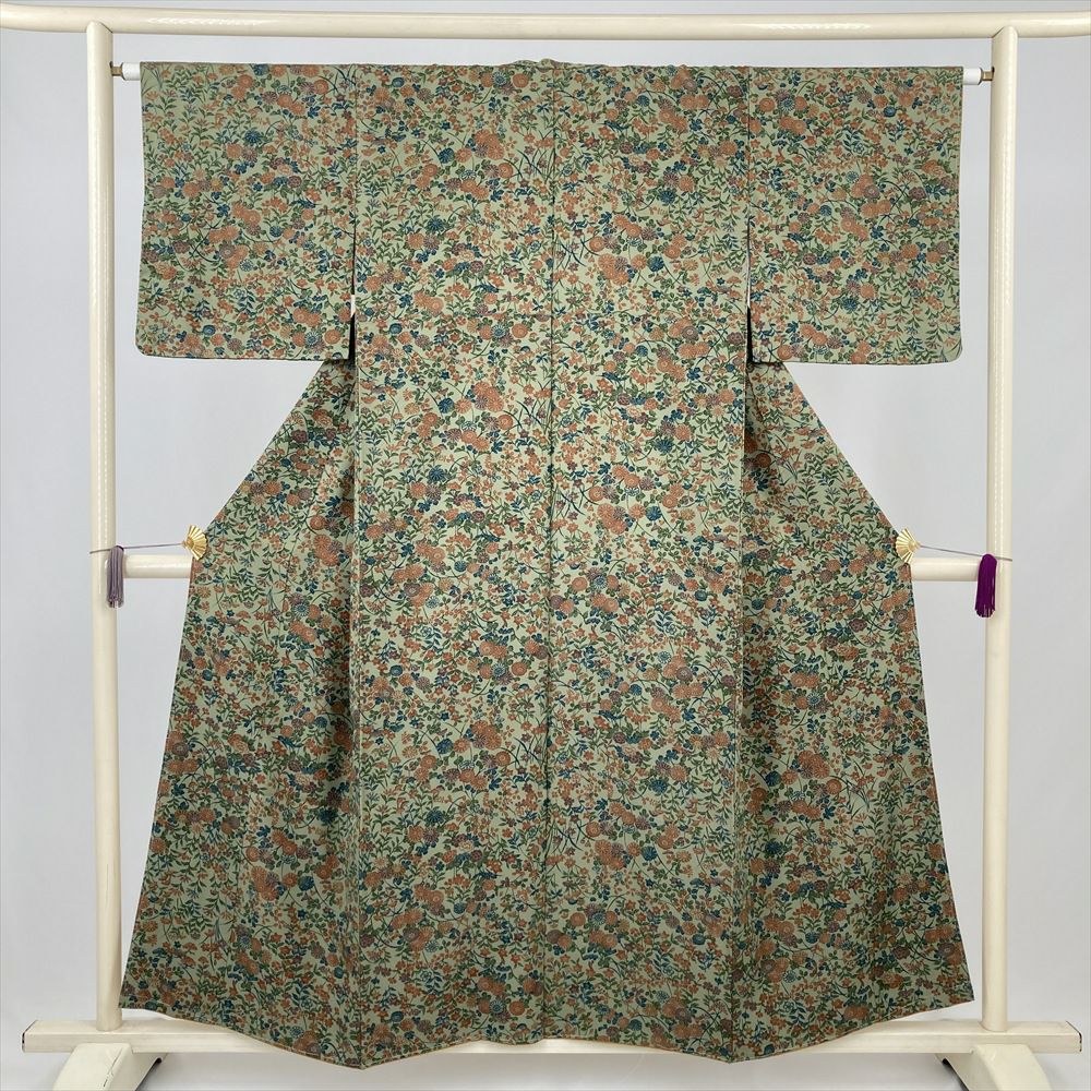 (中古) 小紋 薄緑 カジュアル 菊 萩 撫子 袷 絹【身丈】150cm【裄丈】64cm