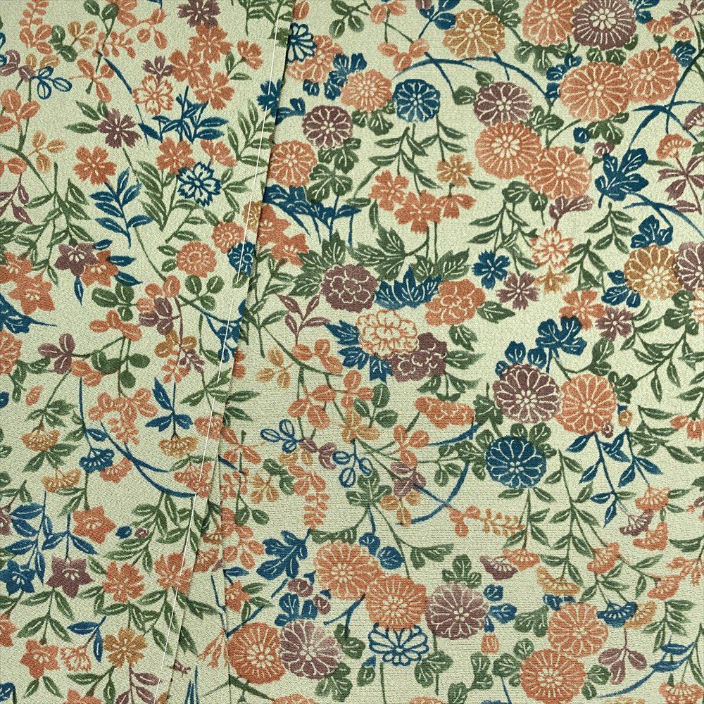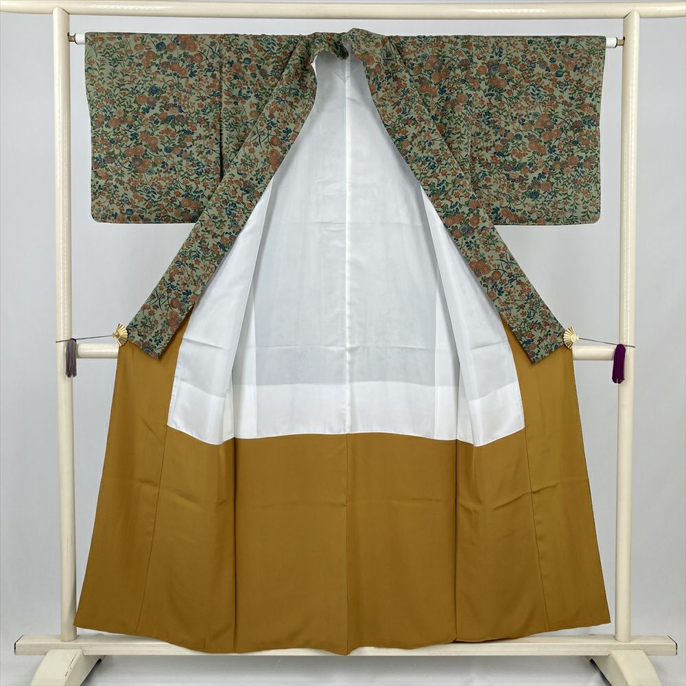 古典的な草花の意匠と落ち着いた色合いが調和し、街着やお出かけ着として幅広く活躍する一着です。