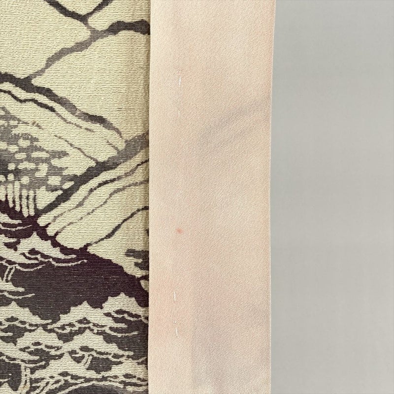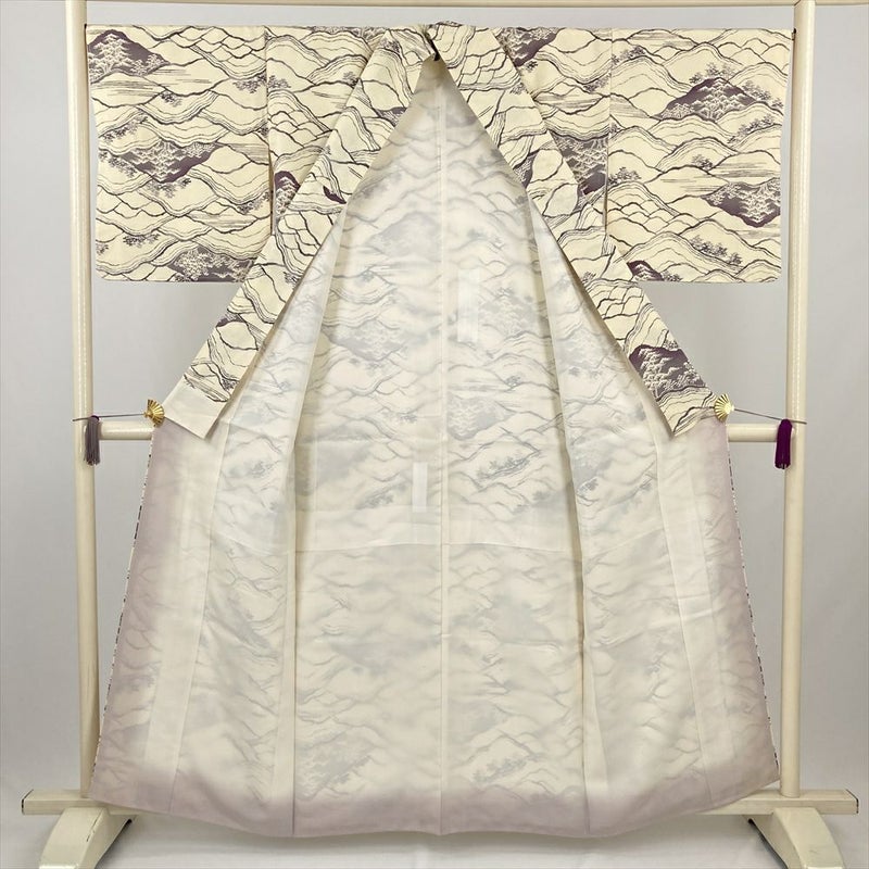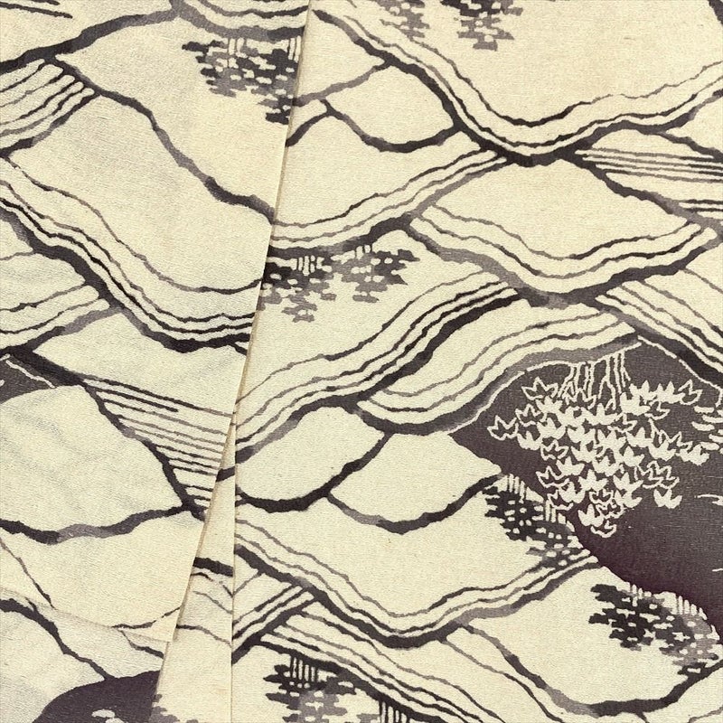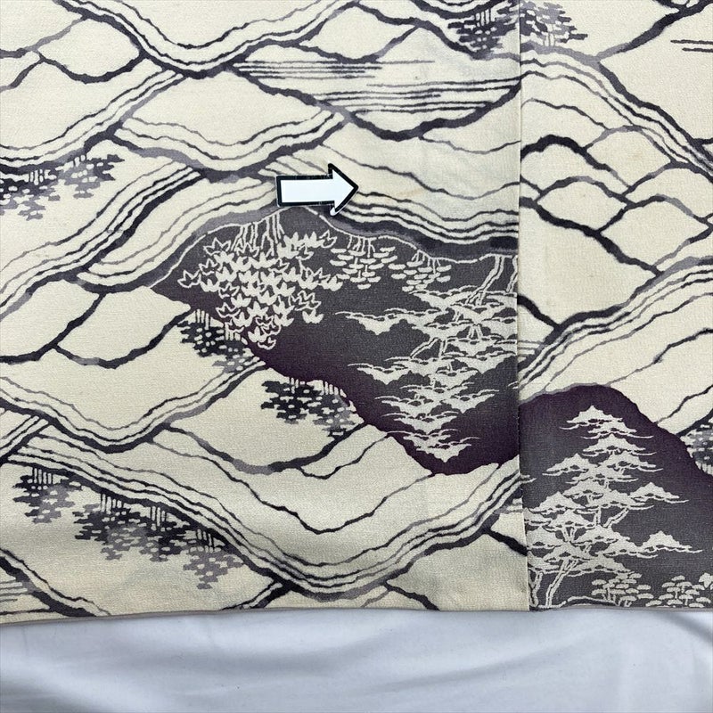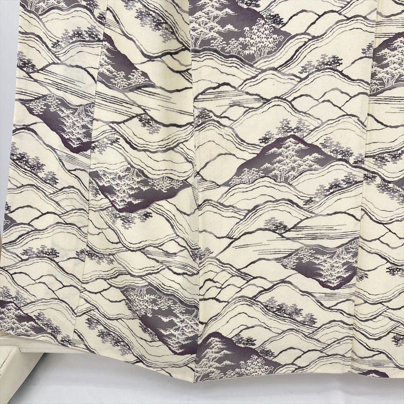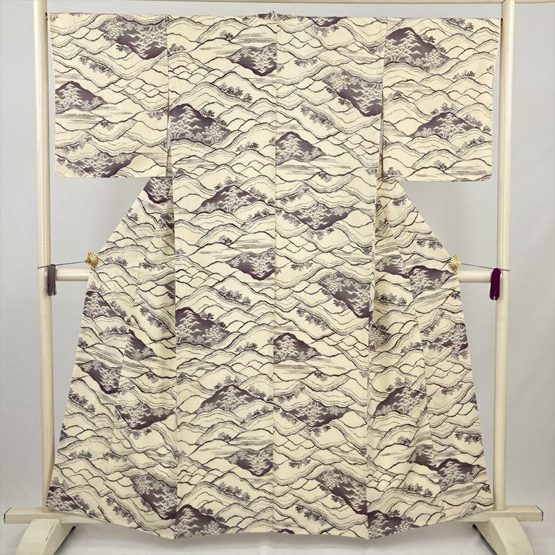 (中古) 小紋 生成り カジュアル 山並み 松 竹 袷 絹【身丈】153.5cm【裄丈】67.5cm