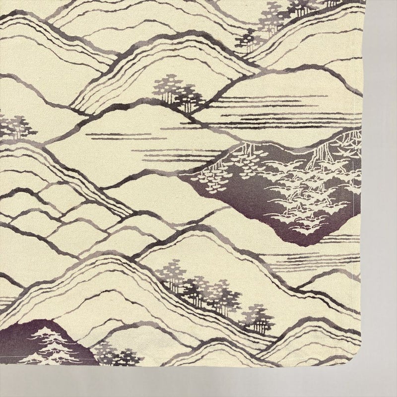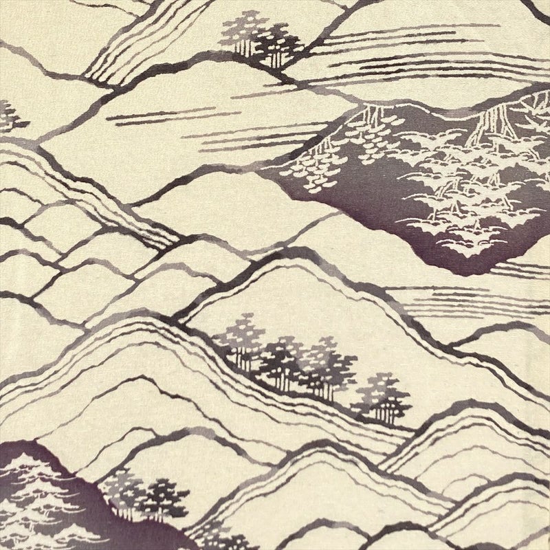 生成りに近いアイボリーの紬地に、松や竹が茂る山並みの風景が染めで表現された、趣深い小紋です。