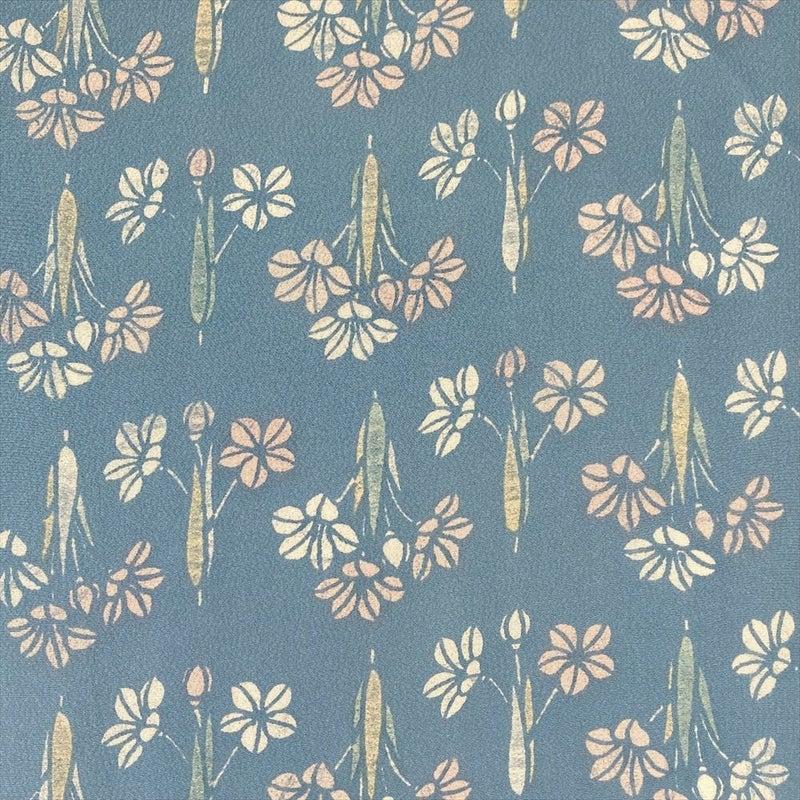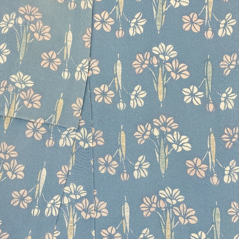 落ち着いた水色の縮緬地に、型絵染めで表現されたスッと伸びる水仙のような草花文様が、静かな品格を漂わせる小紋です。