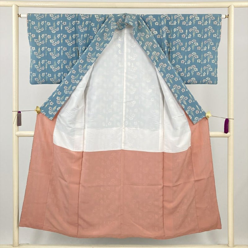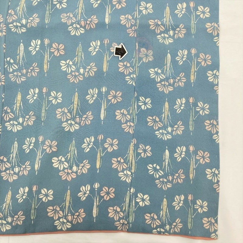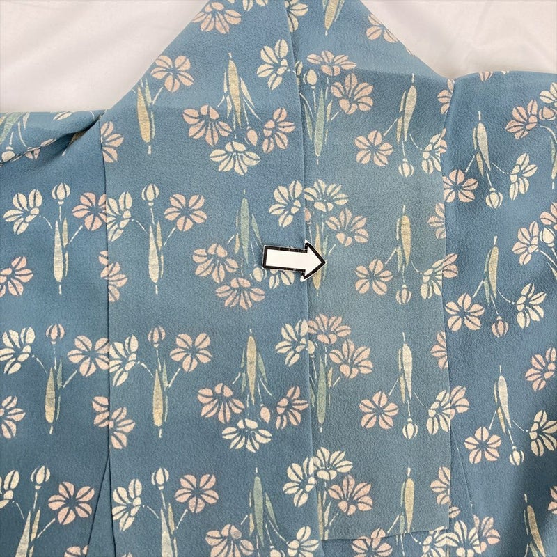 (中古) 小紋 水色 カジュアル 草花 袷 絹【身丈】144cm【裄丈】63cm