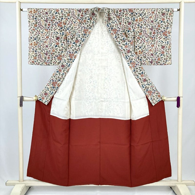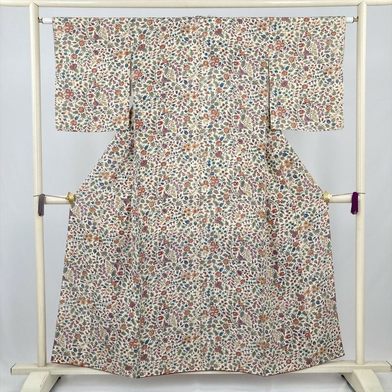 (中古) 小紋 アイボリー 生成り カジュアル 草花 袷 絹【身丈】150.5cm【裄丈】63cm