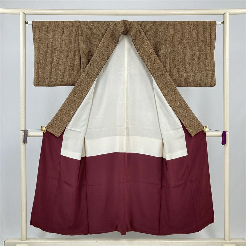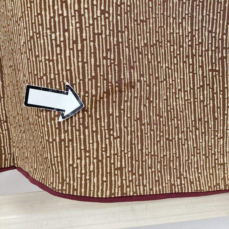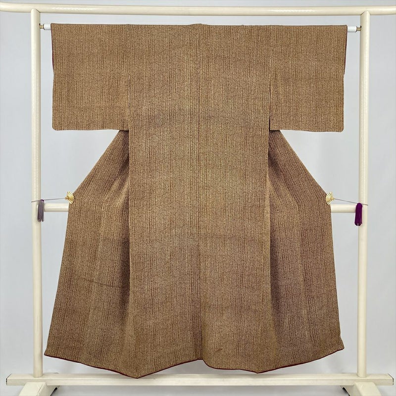 (中古) 小紋 茶色 カジュアル 竹縞 袷 絹【身丈】143cm【裄丈】63.5cm