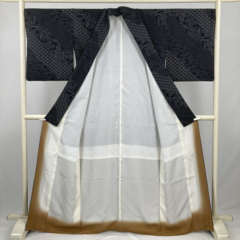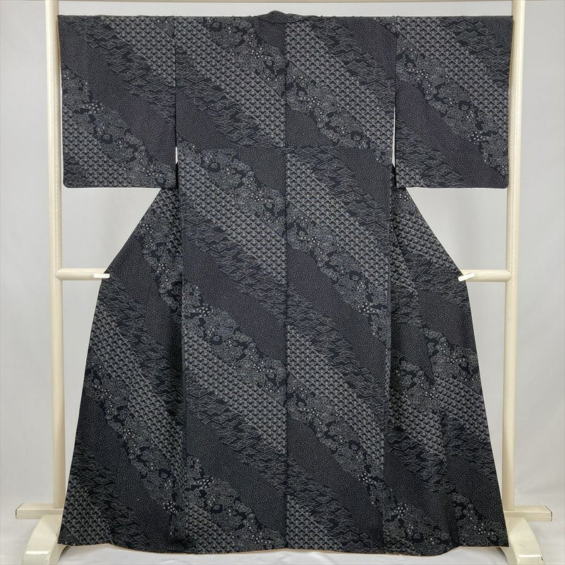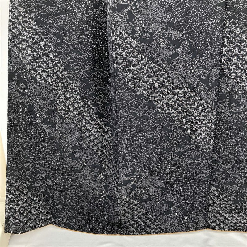 (中古) 小紋 黒 カジュアル 縮緬 斜め取り 松 梅 霰 袷 絹 【身丈】157.5cm【裄丈】70cm