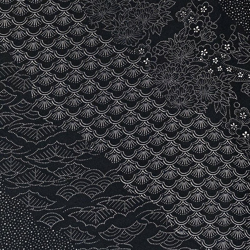 細かな縮緬地に、松竹梅と霰文様を斜め取りに配した、黒と白のコントラストが美しい一枚。