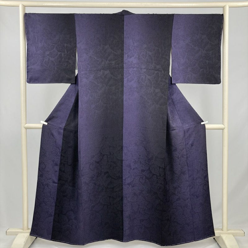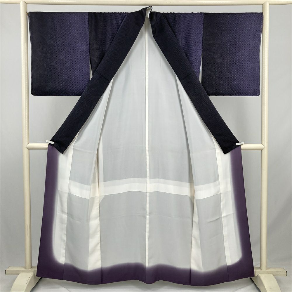 (中古) 小紋 紫 黒 カジュアル 市松 ドット 葉 光沢感 袷 絹 【身丈】155cm【裄丈】68.5cm