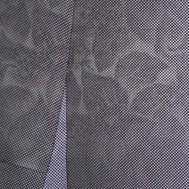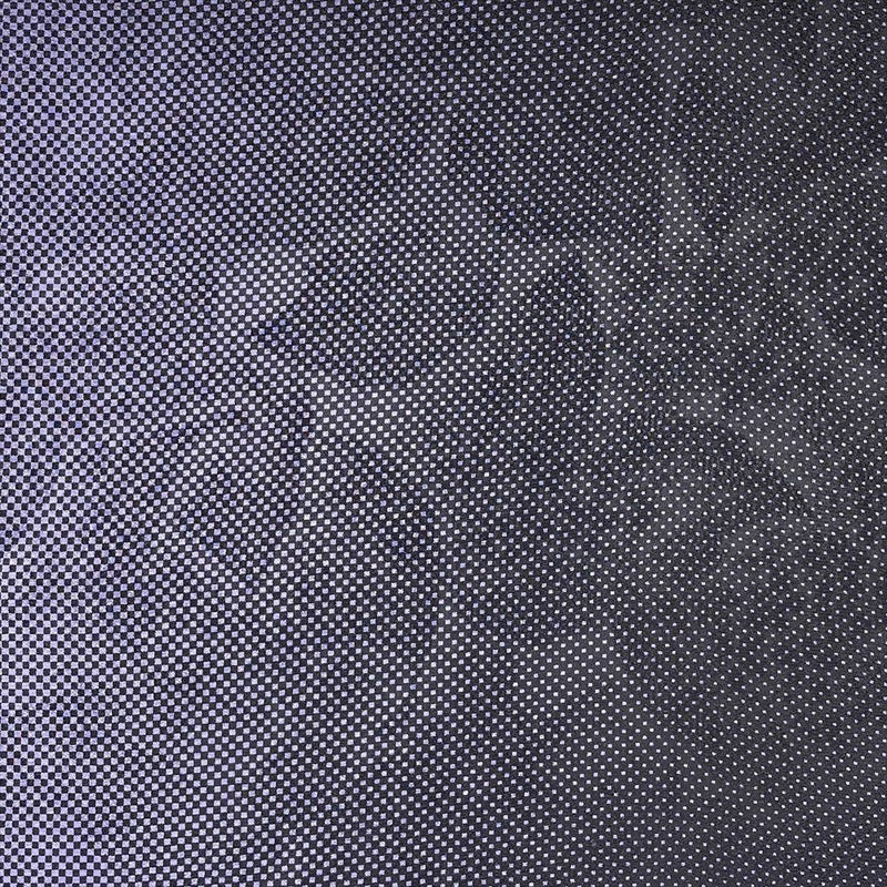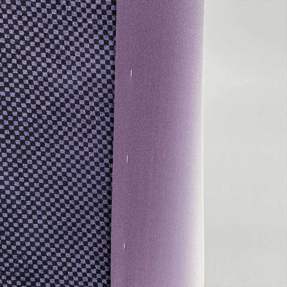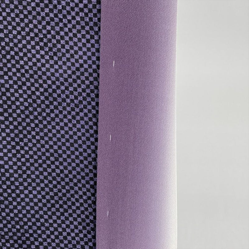 <div class=紫×黒に市松とドット、動くたびに葉模様がリズミカルに浮かぶ、遊び心あるデザインの小紋。