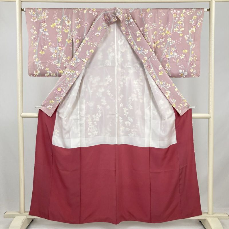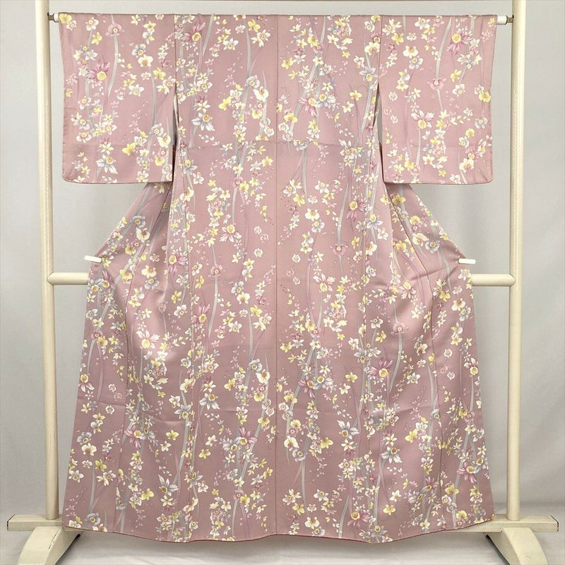 (中古) 小紋 ピンク カジュアル すいせんの花 袷 絹 【身丈】154cm【裄丈】65cm
