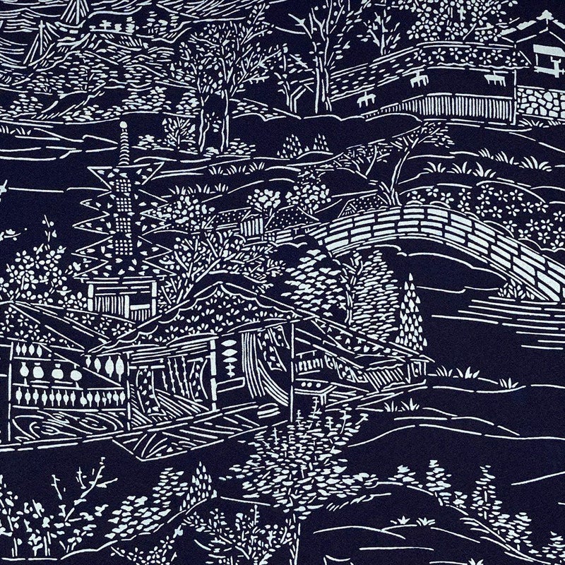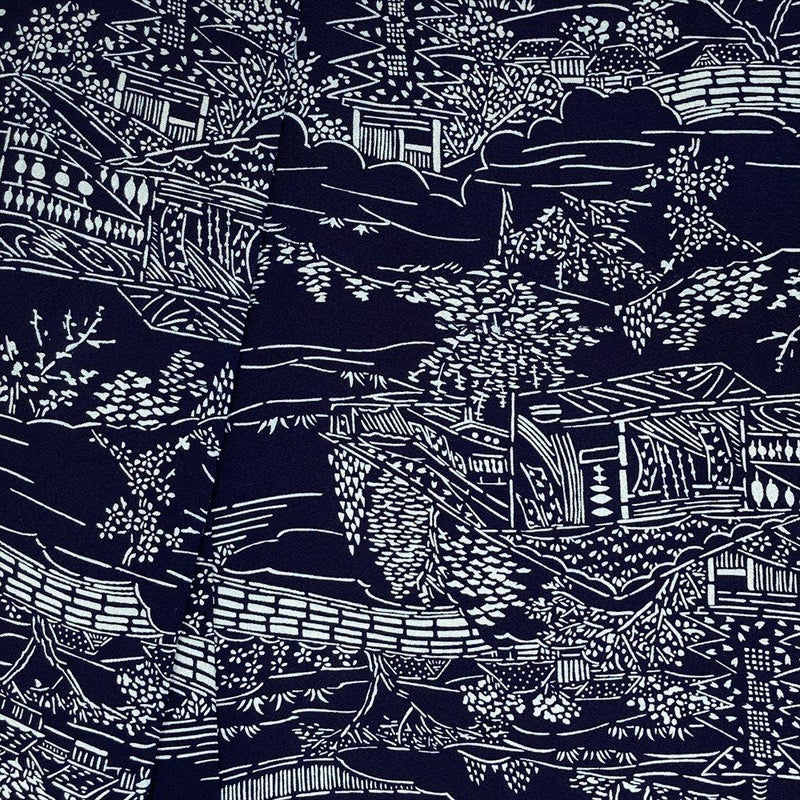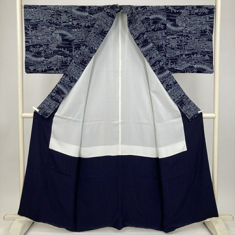 (中古) 小紋 紺 カジュアル 景色文 袷 絹 【身丈】155cm【裄丈】67.5cm