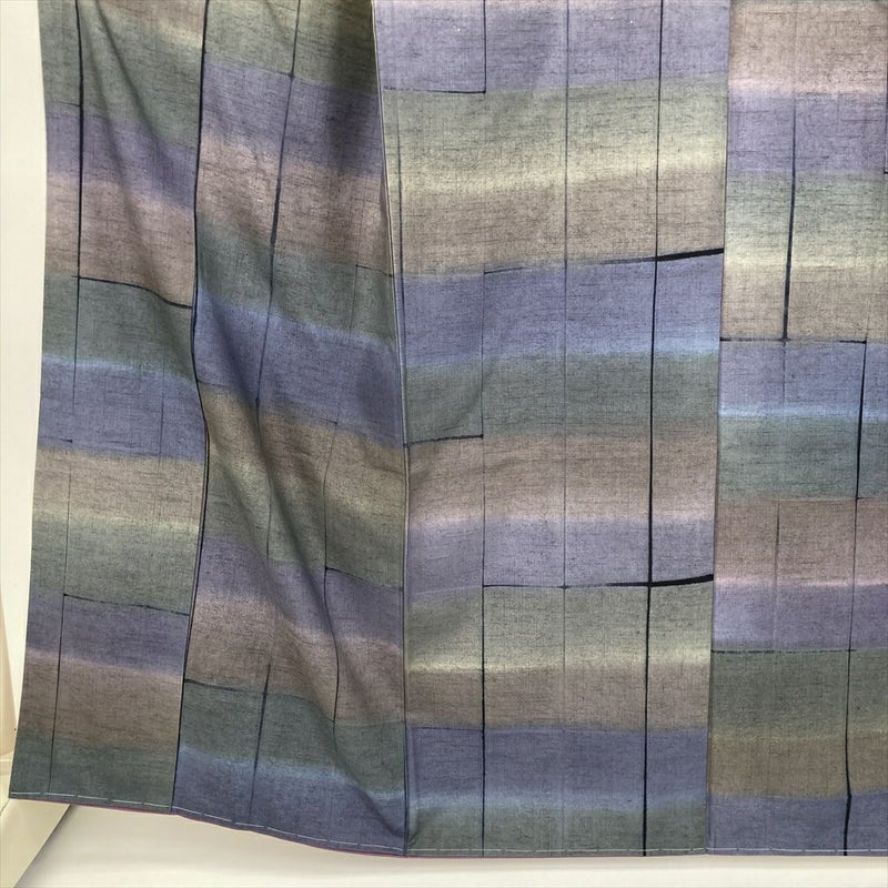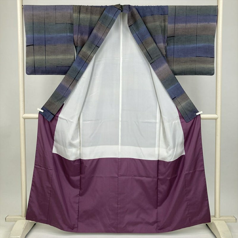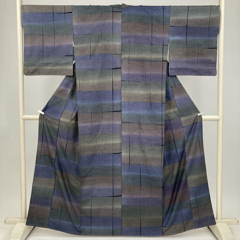 (中古) 小紋 青 紫 翠 カジュアル ぼかし 途切れ格子 袷 絹 【身丈】157cm【裄丈】69cm