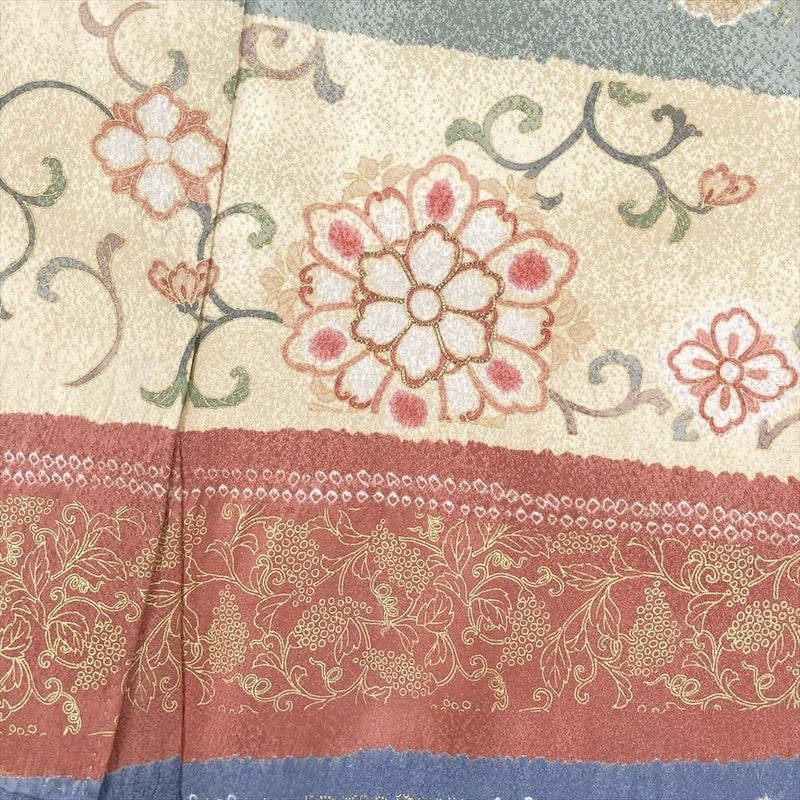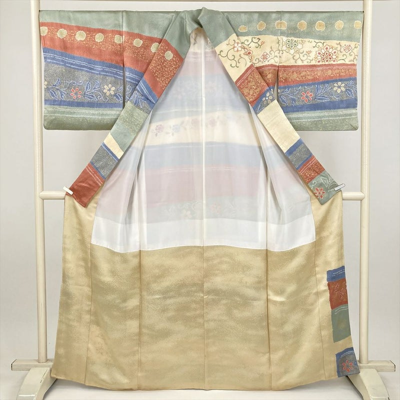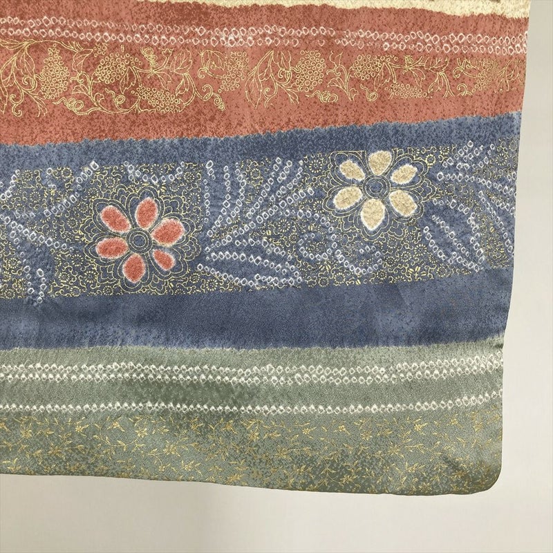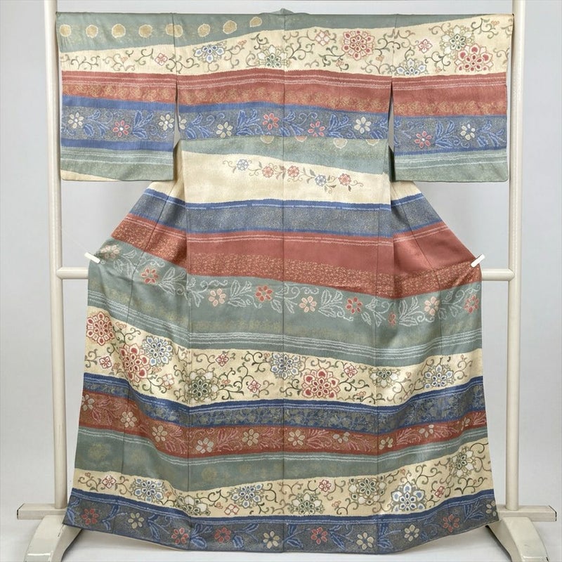 (中古) 小紋 マルチカラー カジュアル 地紋織り 横段 絞り 刺繍 天平文 袷 絹【身丈】160cm【裄丈】68.5cm