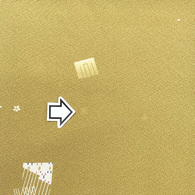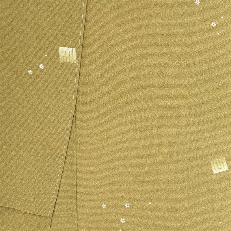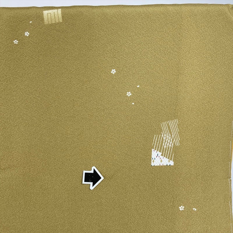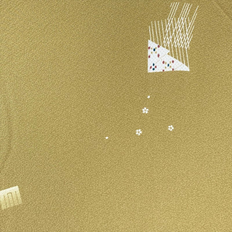 <div class=落ち着きのある芥子色地に、源氏香と小さな桜文様を散りばめた上品な小紋。