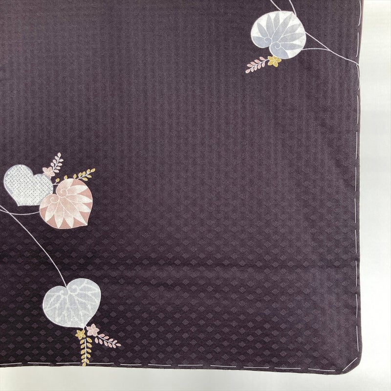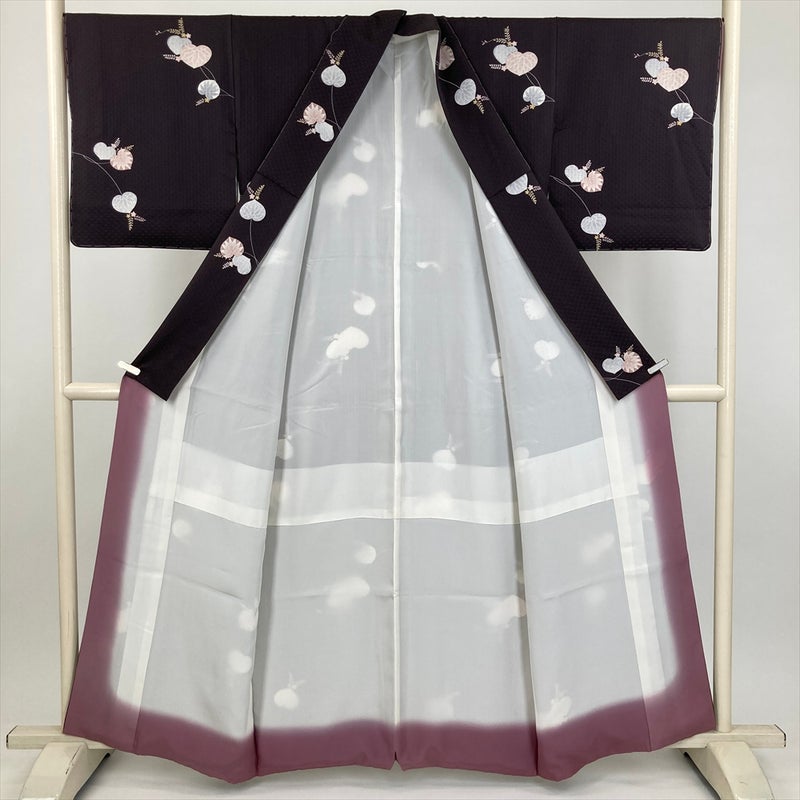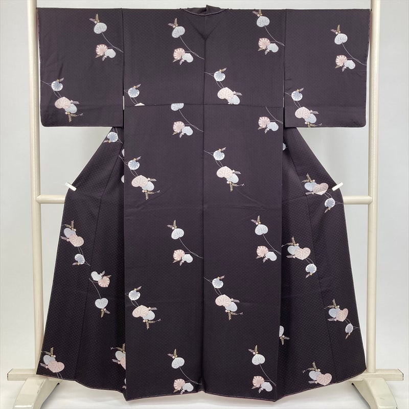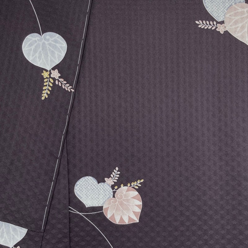 深みのあるこげ茶の地に、光の加減で浮き沈みする菱紋の地紋が美しい一着です。