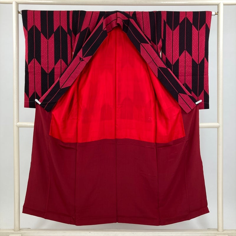 (中古) 小紋 深紅 ヴィンテージ 矢絣 華紋 刺繍 地紋織り 袷 絹 未洗い【身丈】144.5cm【裄丈】64.5cm