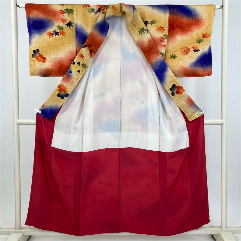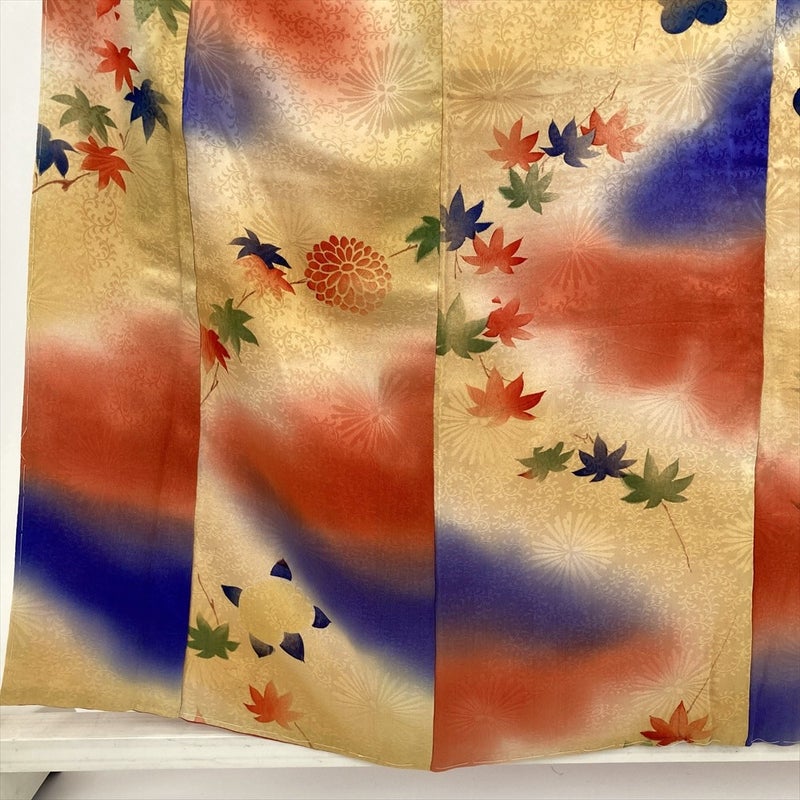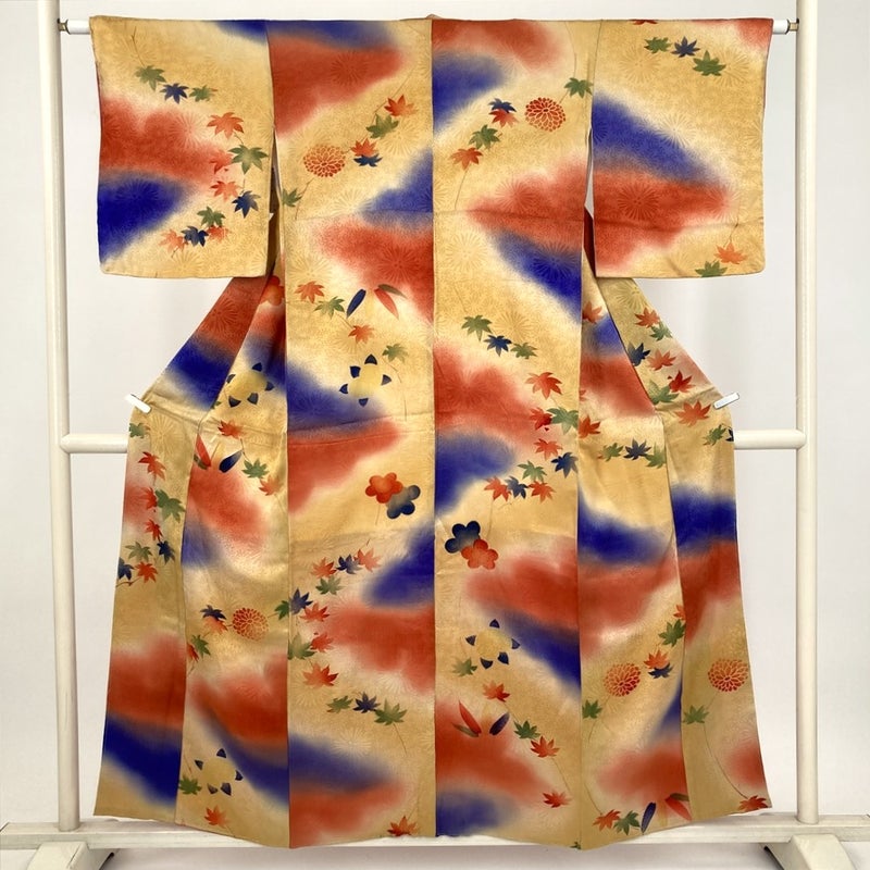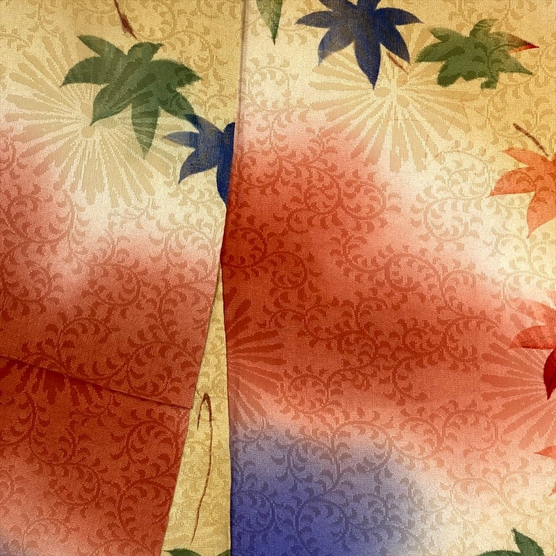 黄色地に、所々赤と青のぼかしがやわらかに広がるヴィンテージ小紋。