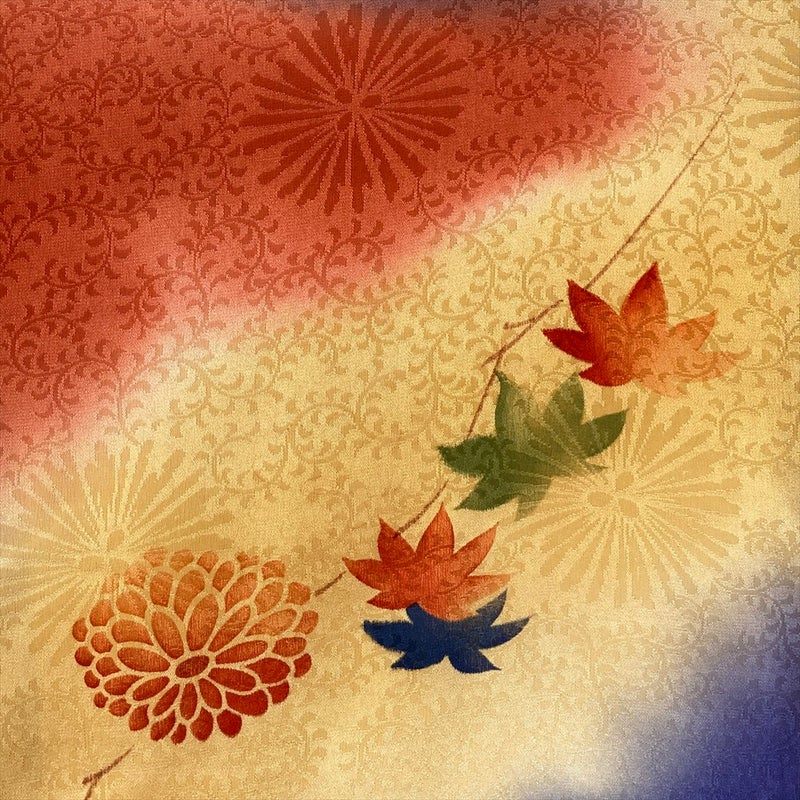 唐草文様の地紋に、笹・菊・紅葉の吉祥柄を配し、華やかさと上品さを併せ持つ一枚です。