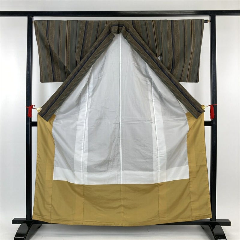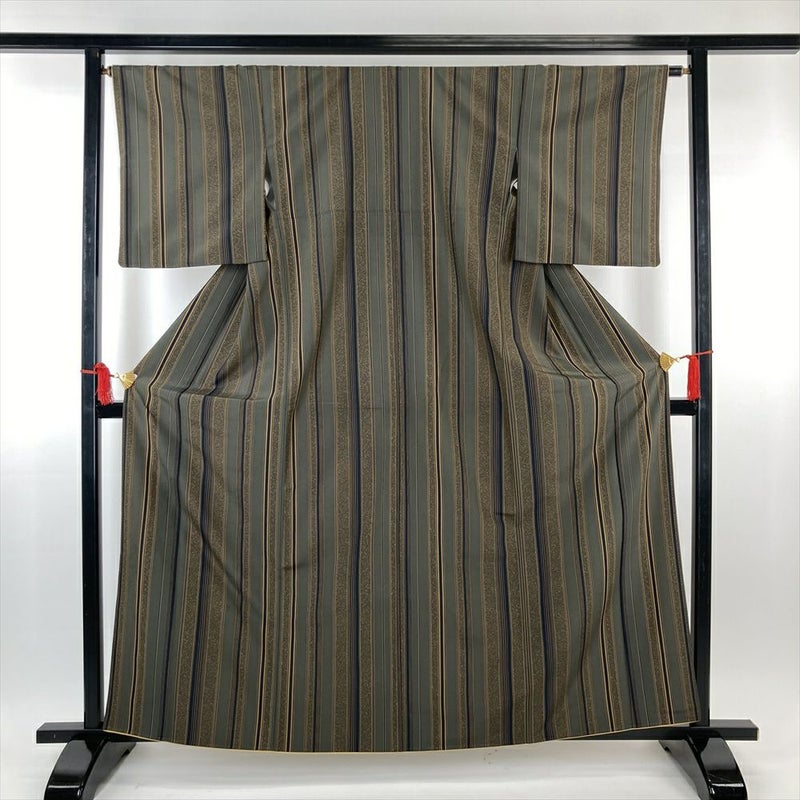 (中古)小紋 茶 ポリエステル 変わり縞 吹雪 袷 S【身丈】157cm 【裄丈】65cm