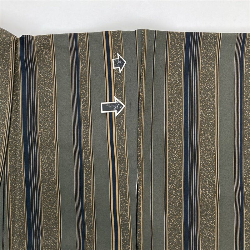 モダンでレトロな印象のお着物です。カジュアルシーン向けです。普段使いに、ちょっとしたお出かけに、お好きなコーディネートをお楽しみくださいませ。上前と左胸(袖付け付近)にシミあり。