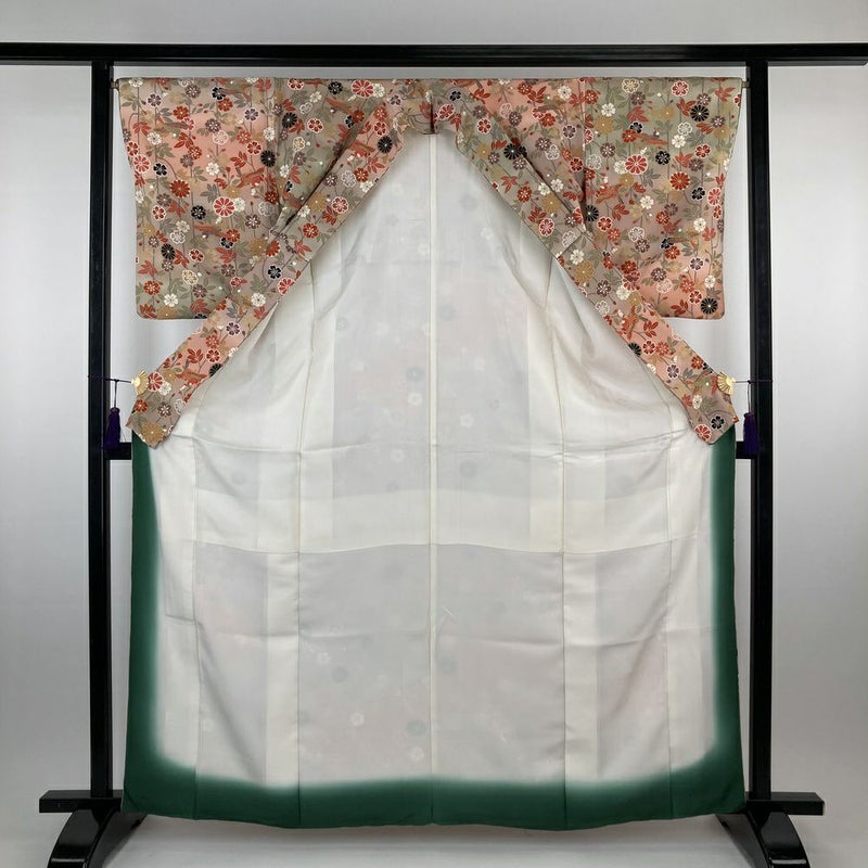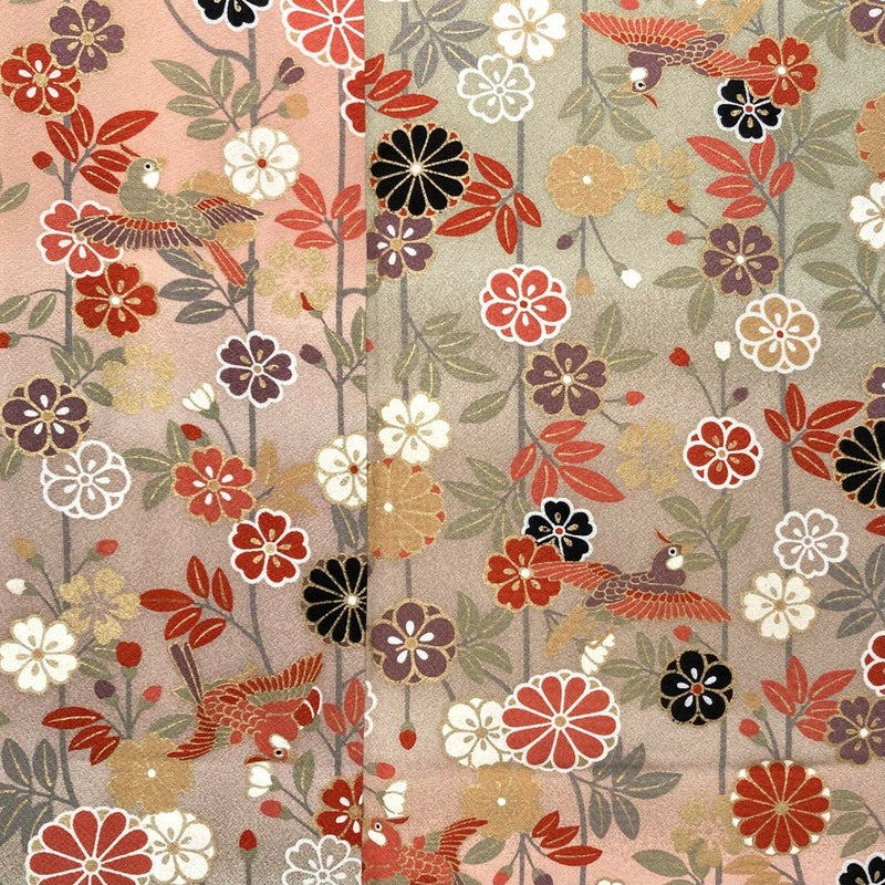 【色柄】ピンクベージュ緑 ちりめん ぼかし 金彩 鳥 四季花 未洗い 袷