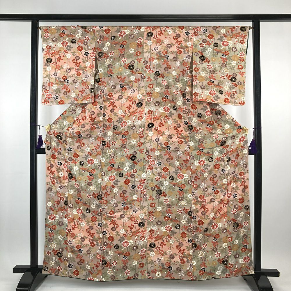 (中古)小紋 ピンク ベージュ カジュアル ちりめん ぼかし染め 金彩 鳥 四季花 袷 未洗い S【身丈】158cm 【裄丈】67cm