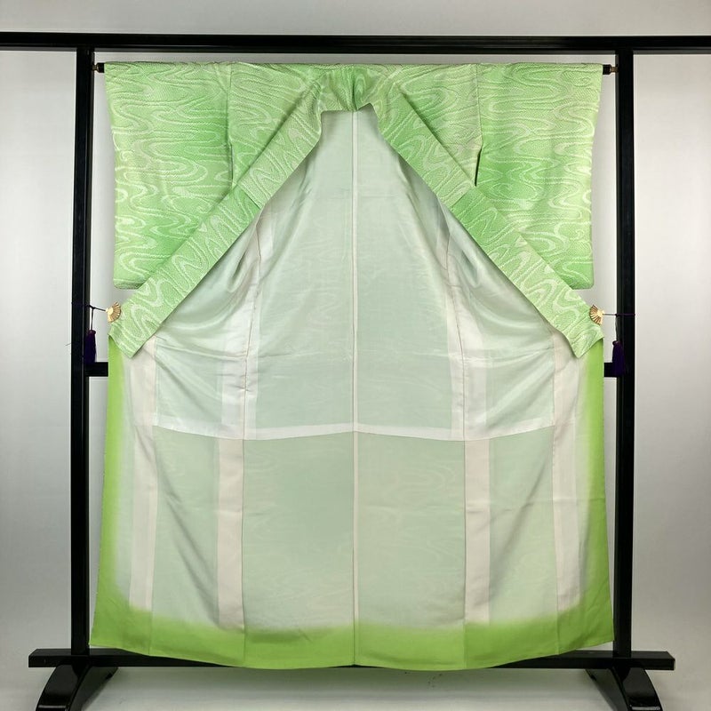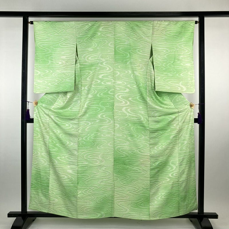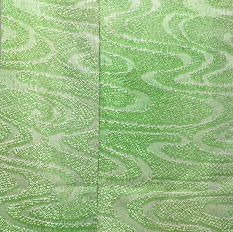 【色柄】黄緑 地紋織り 鹿の子 流水 未洗い 袷