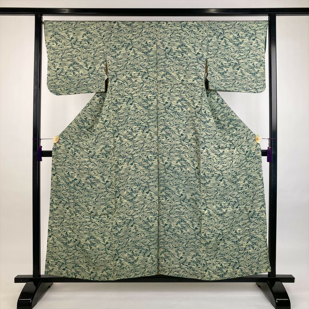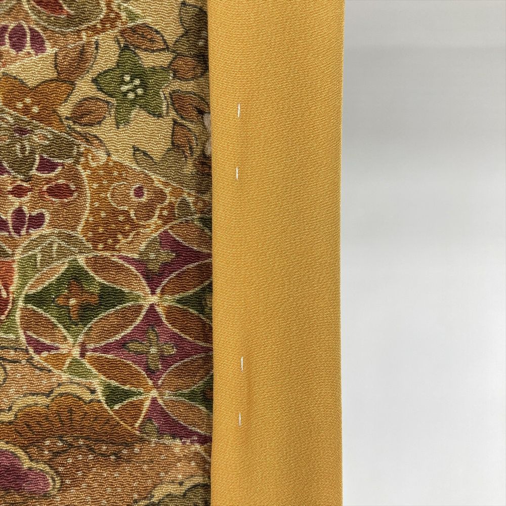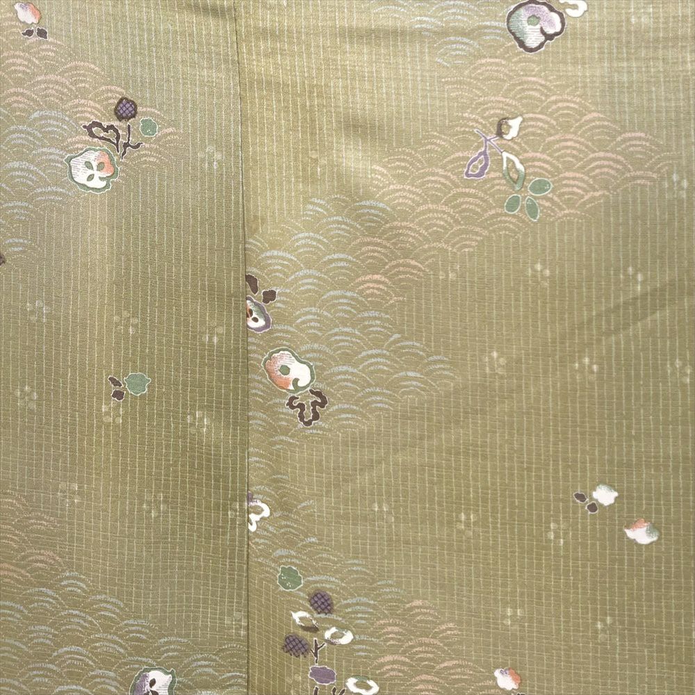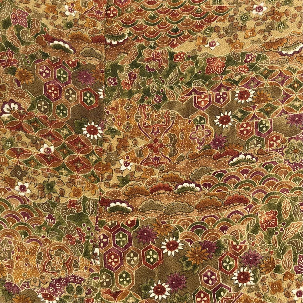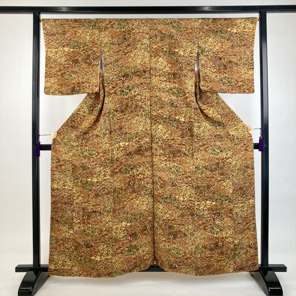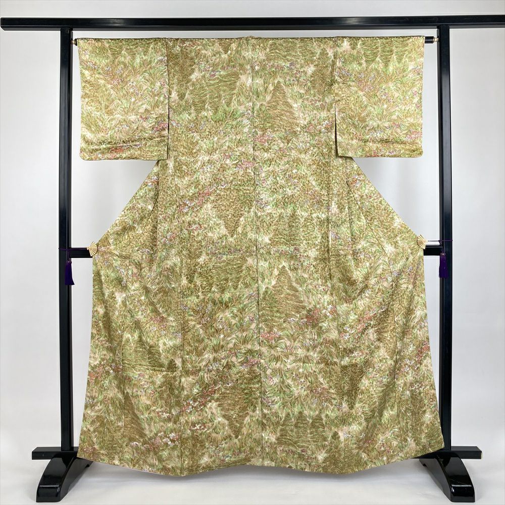 他の画像を見る (中古)小紋 ベージュ 黄色 緑 カジュアル ちりめん 染め 唐花唐草 吉祥文 オリエンタル 袷 SS【身丈】153cm【裄丈】66.5cm ¥ 16,500 税込 お気に入りに登録する