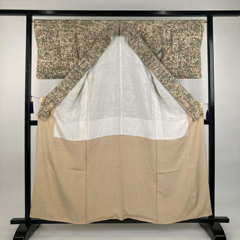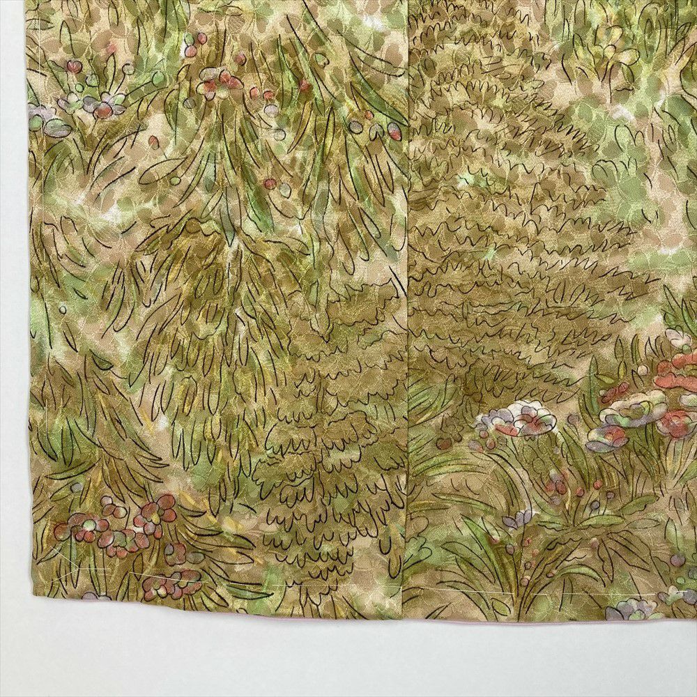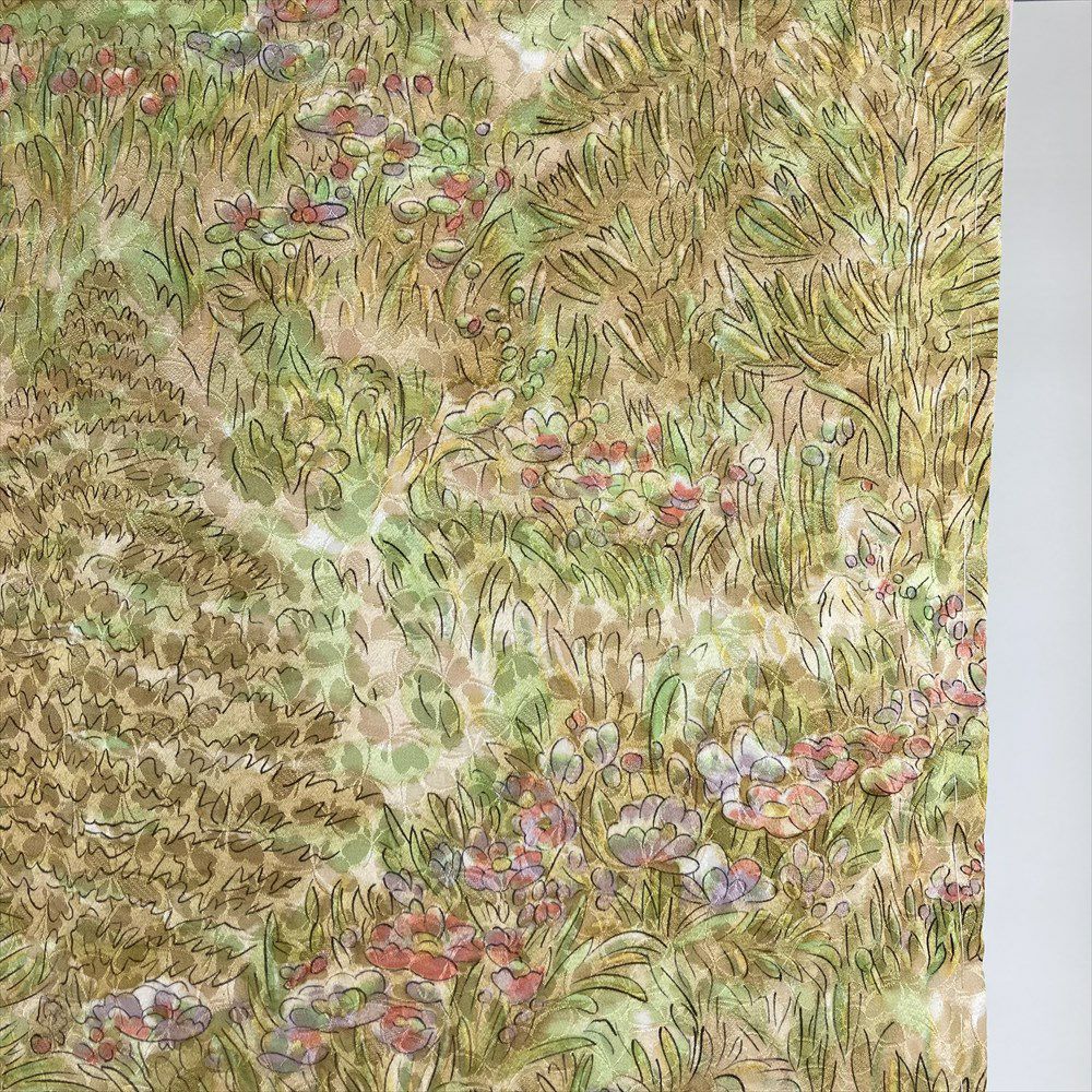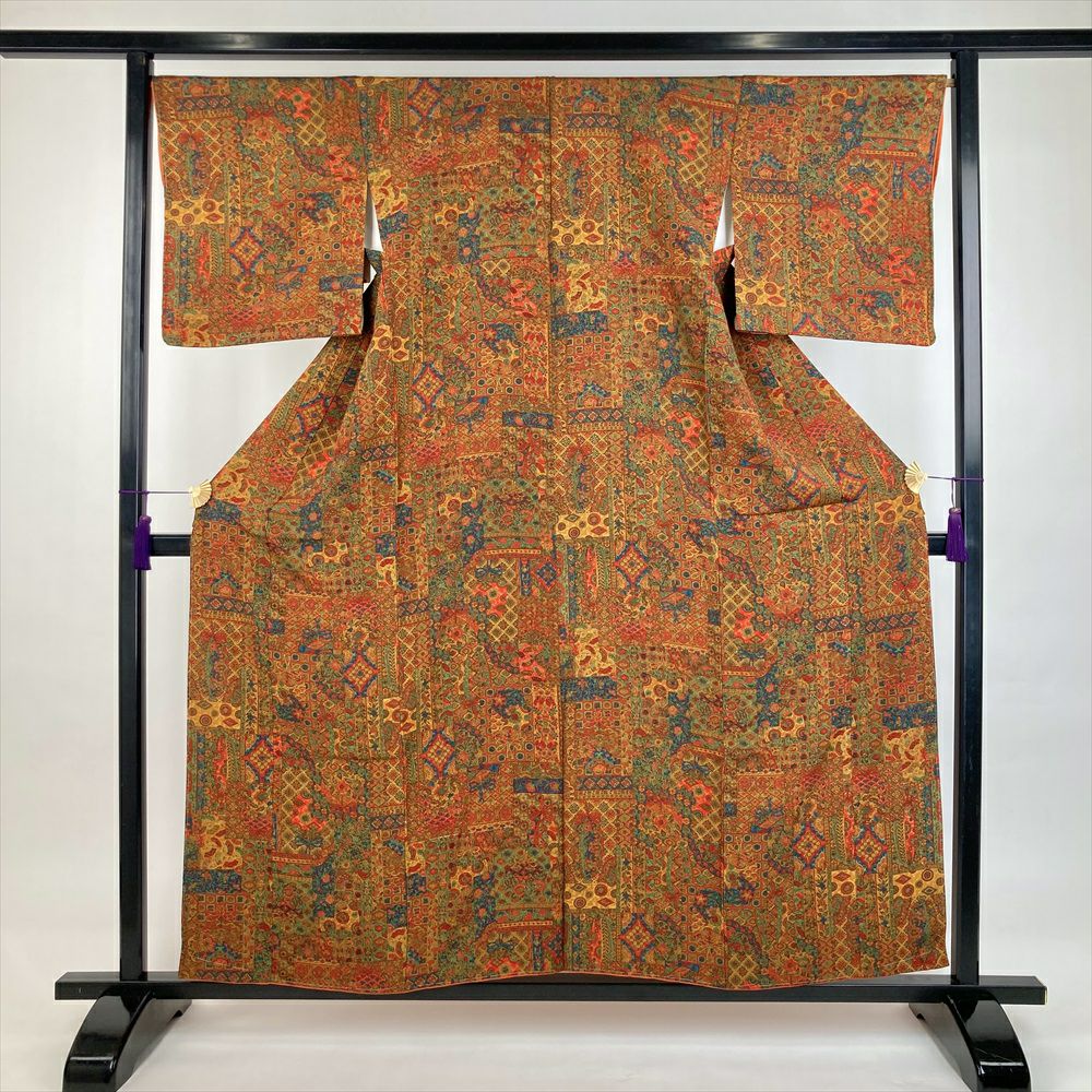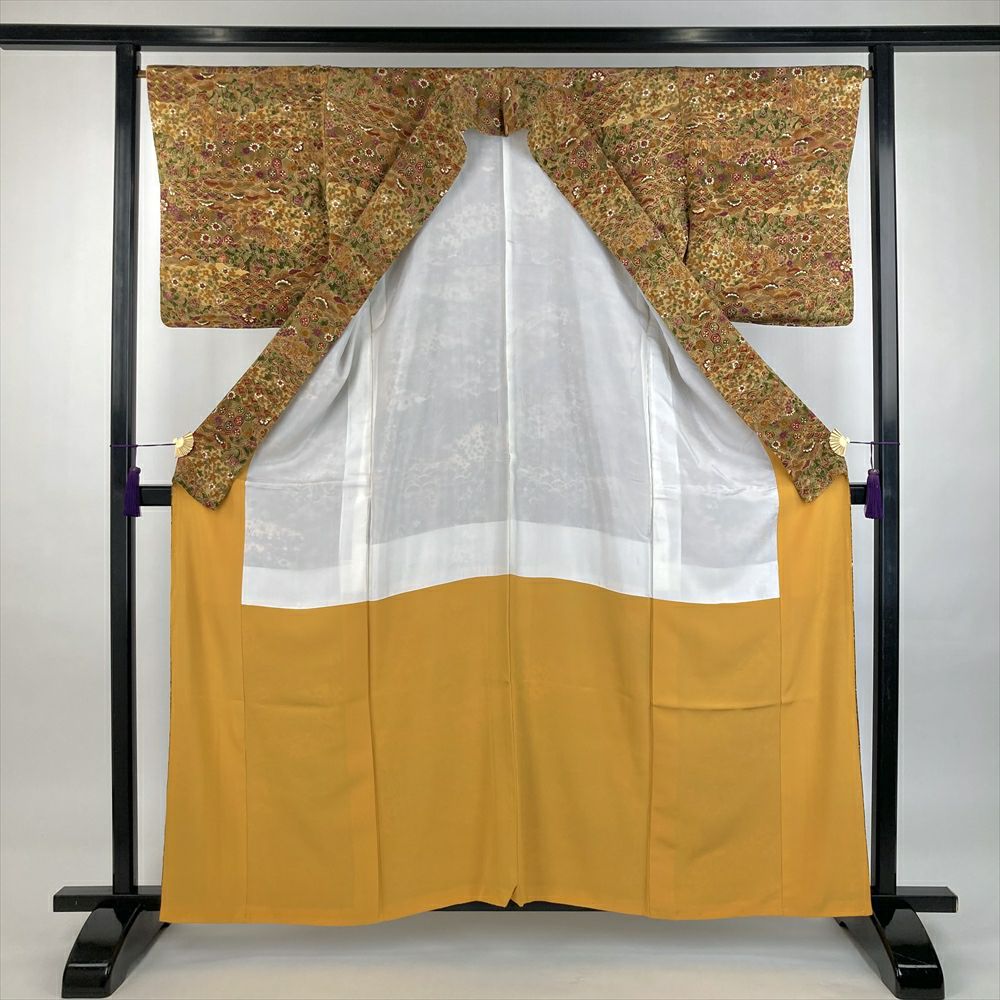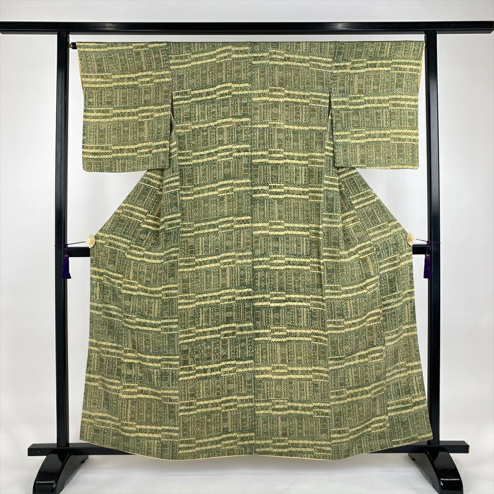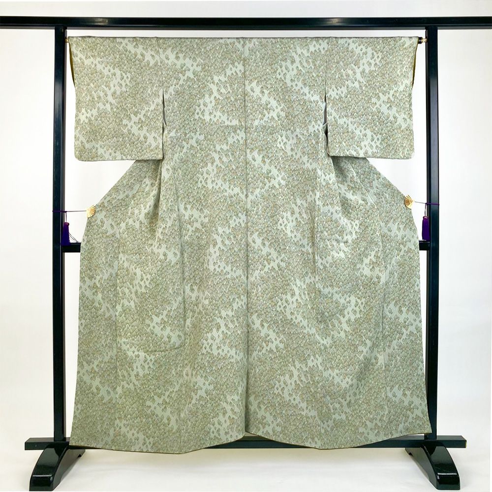 他の画像を見る (中古)小紋 ベージュ 黄色 緑 カジュアル ちりめん 染め 唐花唐草 吉祥文 オリエンタル 袷 SS【身丈】153cm【裄丈】66.5cm ¥ 16,500 税込 お気に入りに登録する