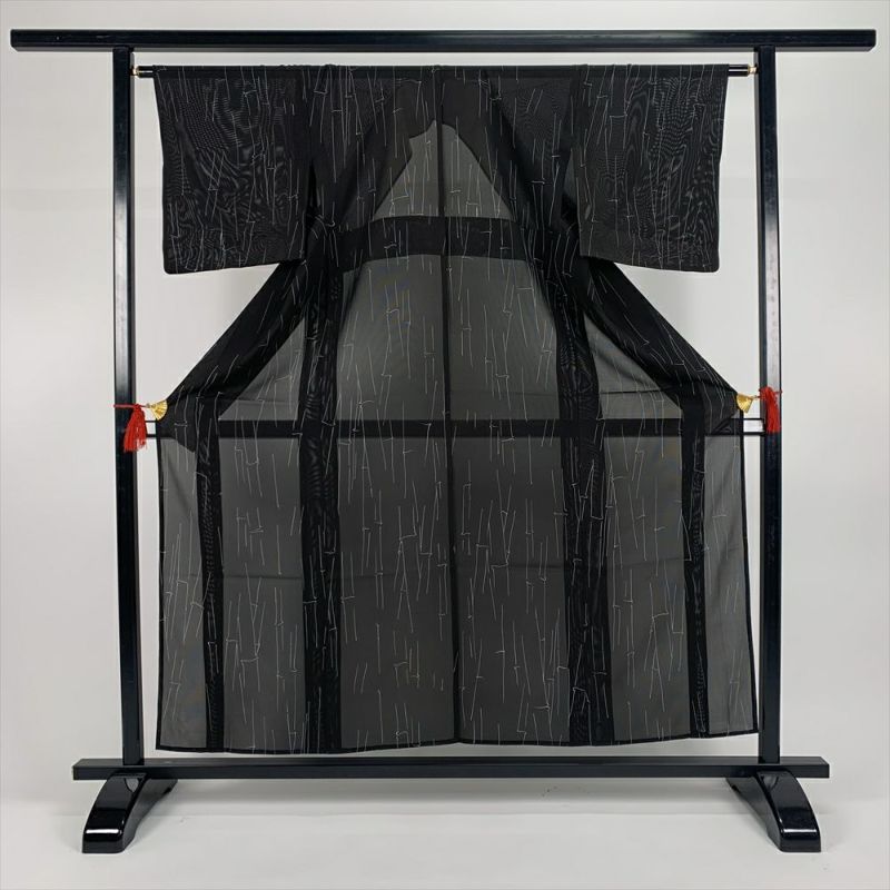 (中古)夏小紋 黒 カジュアル 竹 線画 シンプル クール SS【身丈】150.5cm【裄丈】65.5cm