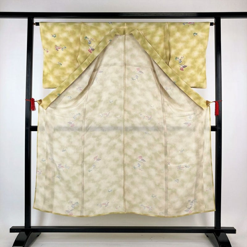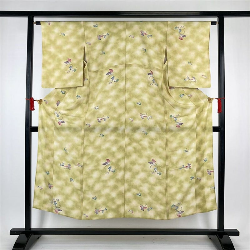 (中古)夏小紋 緑 ちりめん ぼかし 蝶 SS【身丈】144.5cm【裄丈】62.5cm