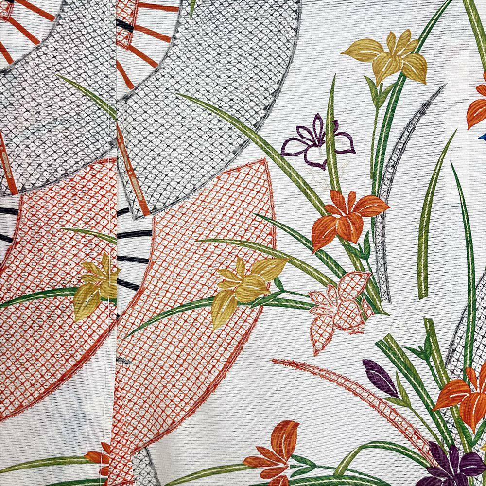 (中古)夏小紋 白 カジュアル 扇 菖蒲 SS【身丈】150.5cm【裄丈】65.5cm