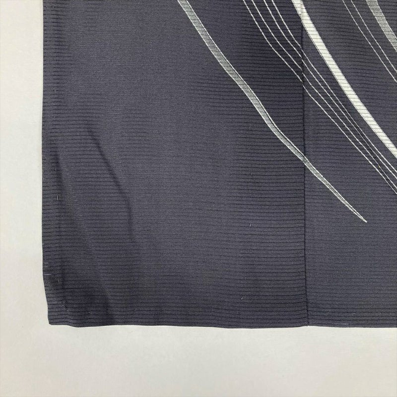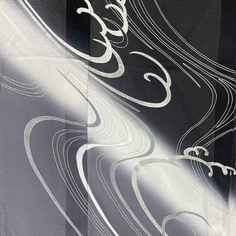 黒地に銀彩の流水文が煌めく印象的なお着物です。帯のコーディネートにより、フォーマルシーン、セミフォーマルシーンでお使いいただけます。お品の状態は良く、しつけ糸が一部ついています。