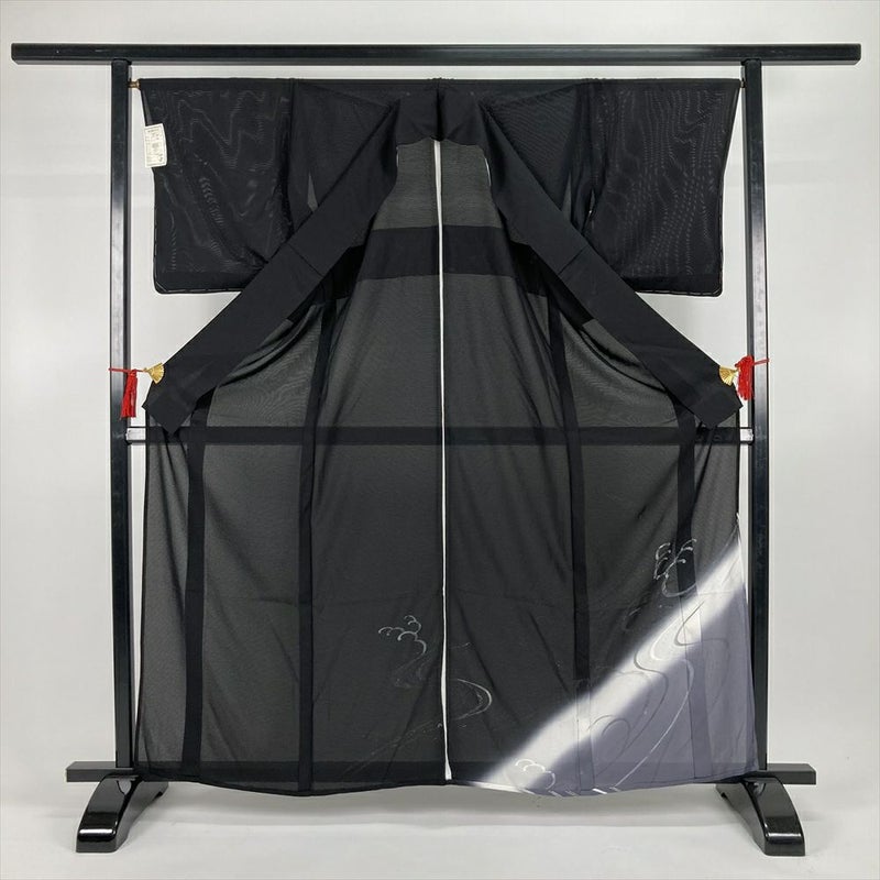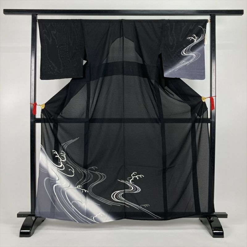 (中古)夏訪問着 黒 フォーマル 絽 流水 波頭 銀彩 グリッター ぼかし染め S【身丈】158.5cm【裄丈】67.5cm