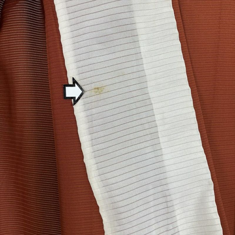 帯次第で、気軽な式典やお茶会などにお使いいただける色無地になります。上前に水ジミ、袖に水ジミと糸浮き、衿裏にスナップのサビ汚れ、胴裏に白い汚れがございます。