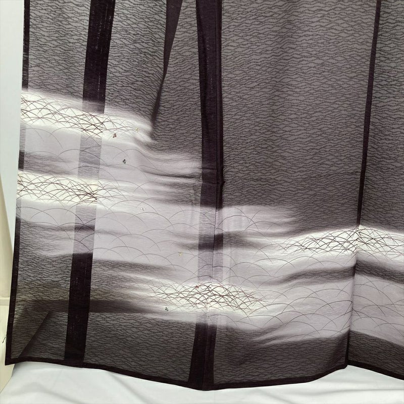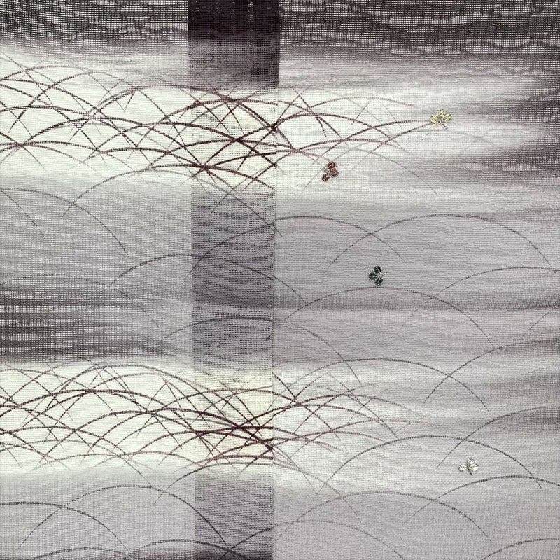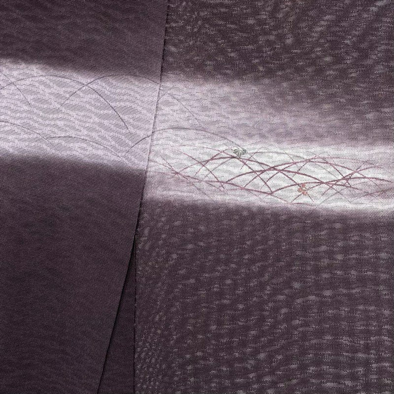 <div class=小豆色の紗地に、霞の中に露芝と萩が描かれた風情ある夏の訪問着。