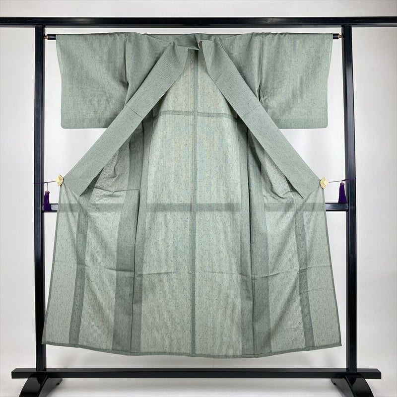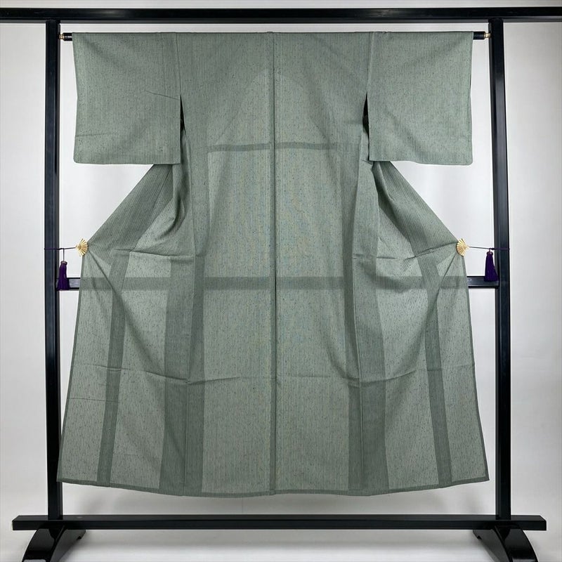(中古)夏紬 深緑 カジュアル 織り 縞 SS【身丈】145.5cm【裄丈】63cm