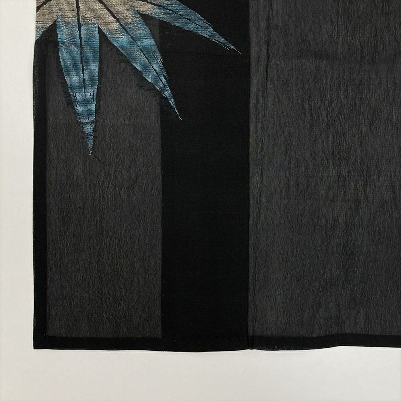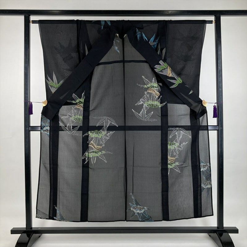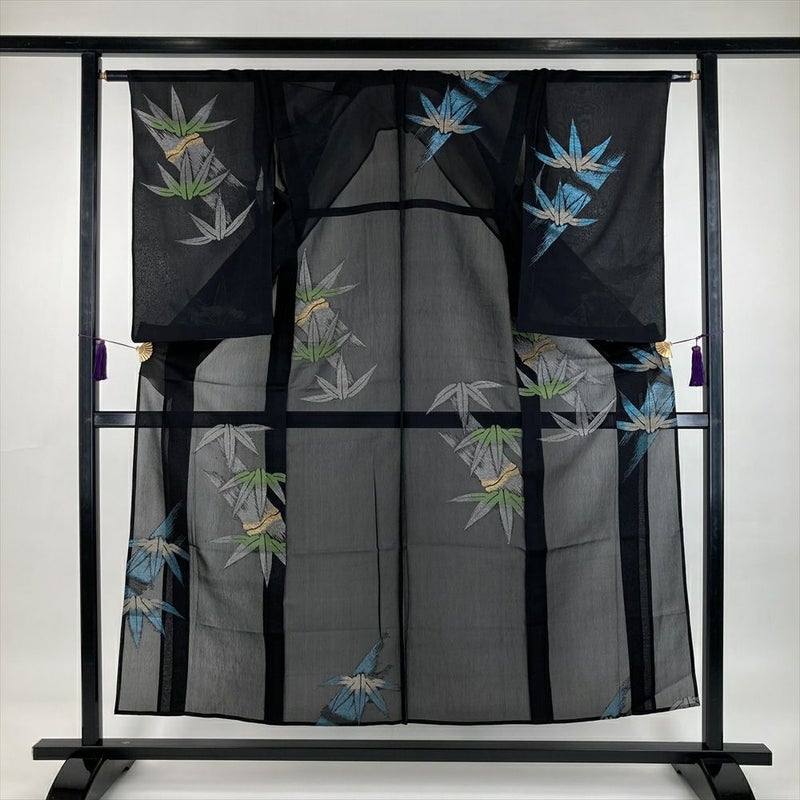 (中古) 夏紬 黒色 カジュアル 金糸 銀糸 笹竹 SS【身丈】150.5cm【裄丈】63cm